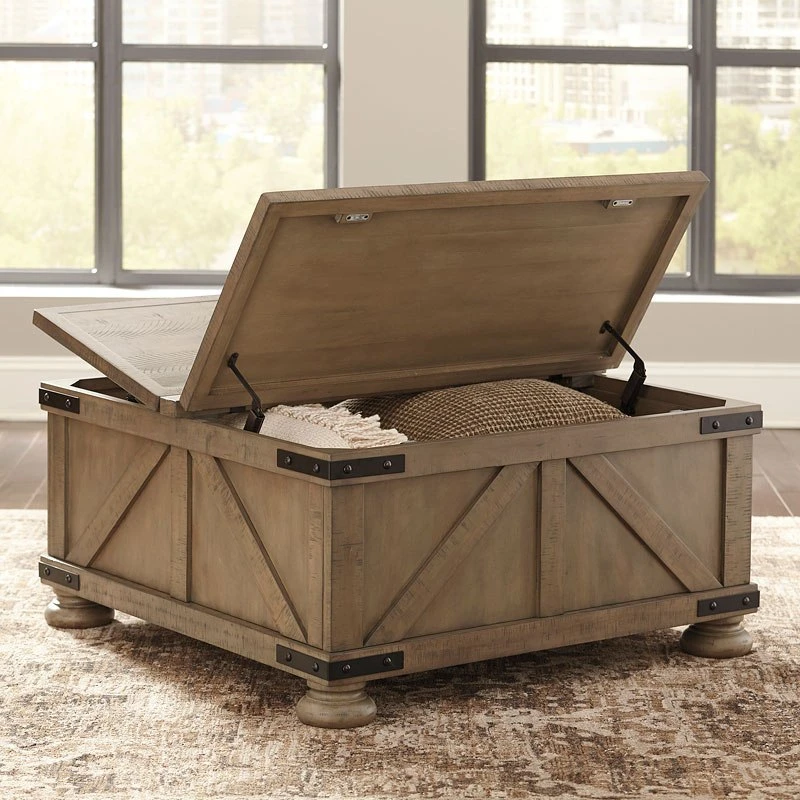 - OverviewDouble up on form and function with the Aldwin square coffee table with storage by Signature Design. Its dual lid tabletop provides easy access to the roomy storage space. Crafted with solid pine wood treated to a weathered gray finish, this generously scaled coffee table is rustic farmhouse living at its best.