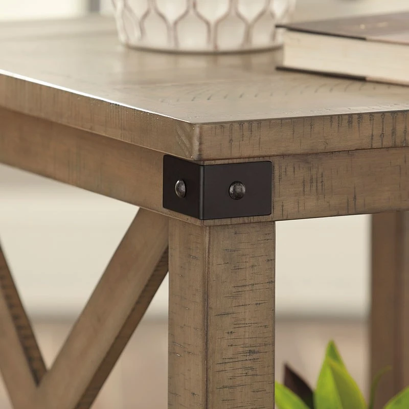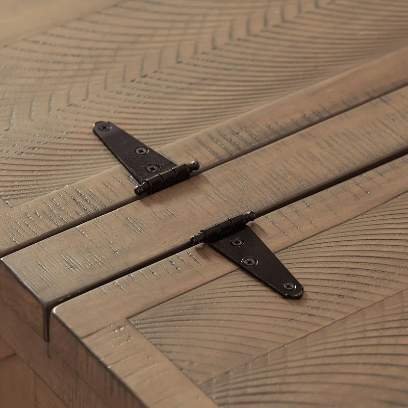 - OverviewDouble up on form and function with the Aldwin Occasional Table Set by Signature Design. The cocktail table’s dual lid tabletop provides easy access to the roomy storage space. Crafted with solid pine wood treated to a weathered gray finish, this generously scaled collection is rustic farmhouse living at its best.