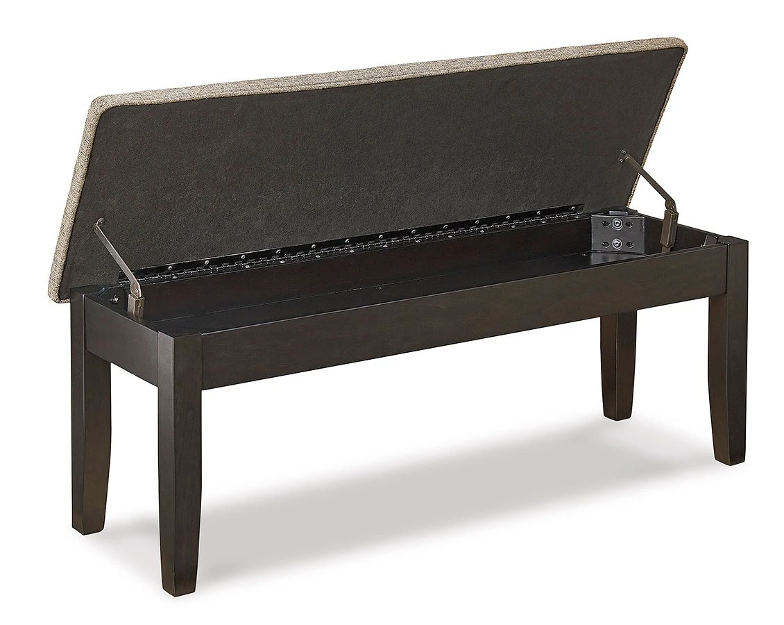 - OverviewThe perfect place for linens, seat cushions and special occasion accents, this Ambenrock storage bench by Signature Design satisfies your appetite for great form and function. This bench is crafted with a dark brown finish and a cushioned seat in light chestnut brown woven fabric.