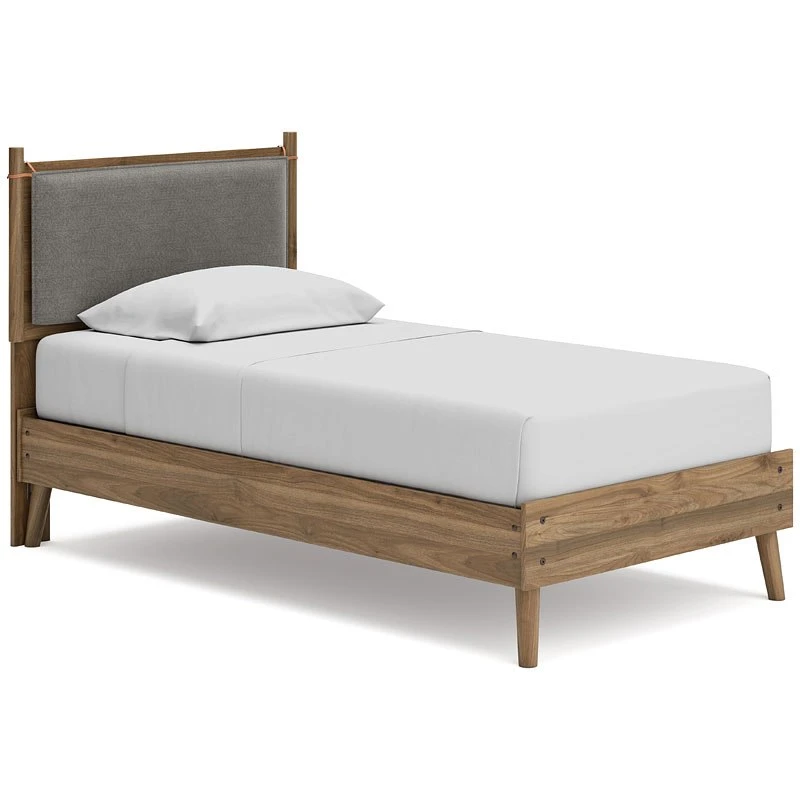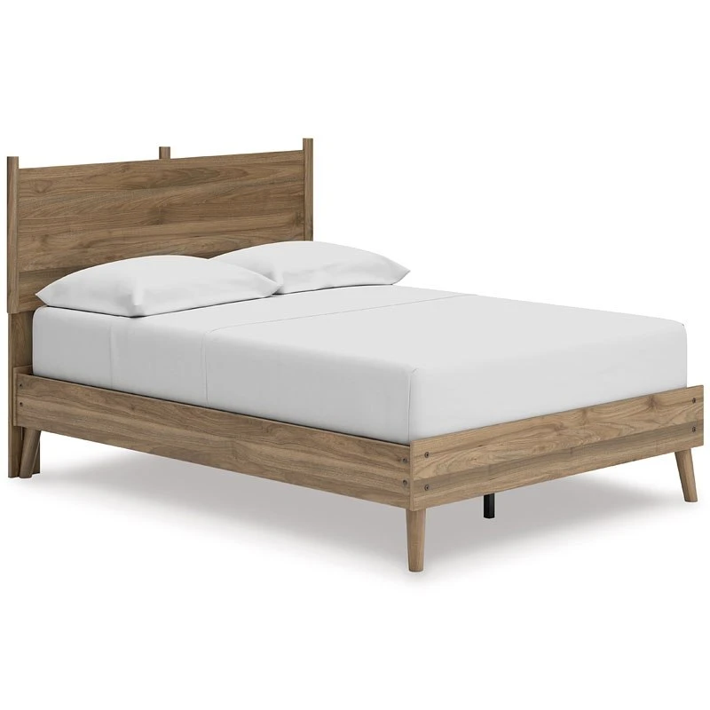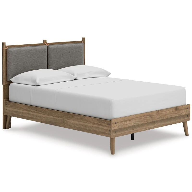 - OverviewDare to take minimalism to the max. This Aprilyn Platform Bed by Signature Design has a richly relaxed feel thanks to its honey brown finish over replicated wood grain. The headboard’s optional reversible cushions are an inventive element, allowing you to choose faux leather or gray fabric to suit your space. There’s no doubt about it: This contemporary piece is sure to become a classic.