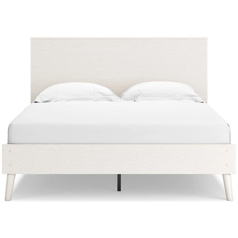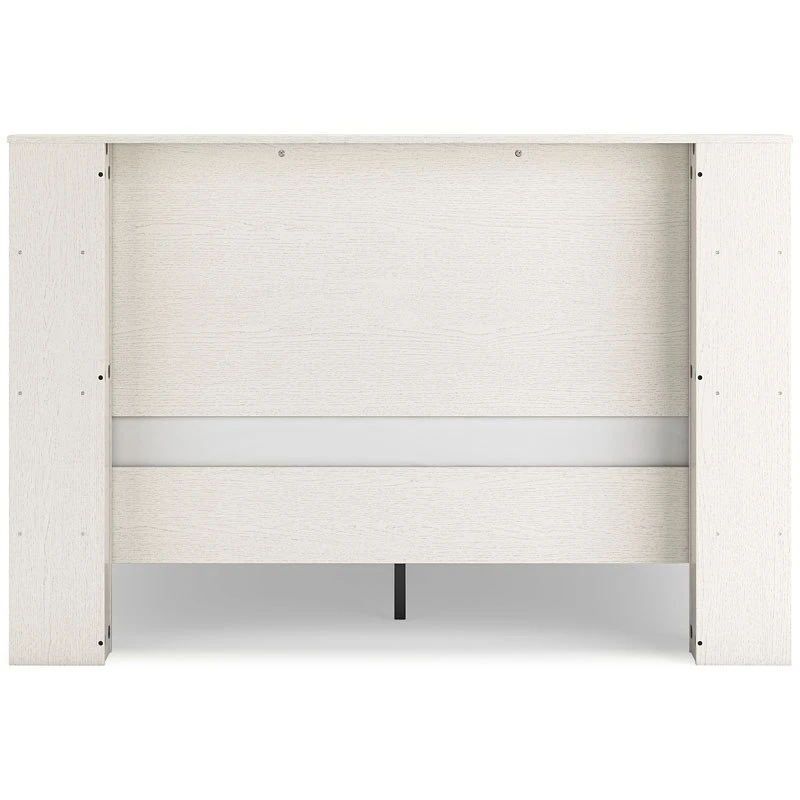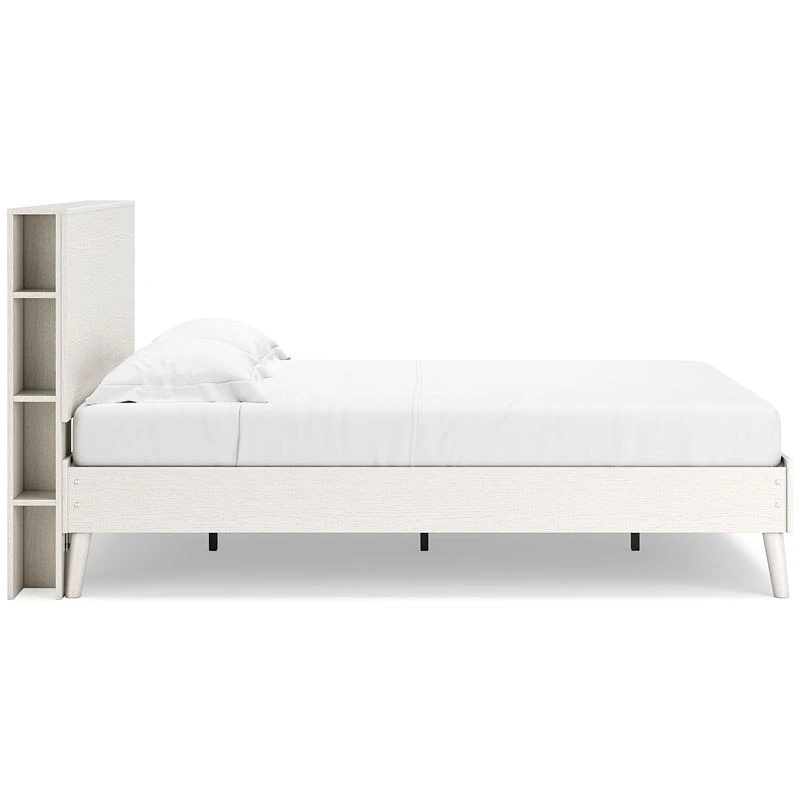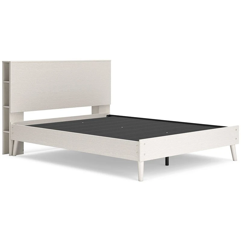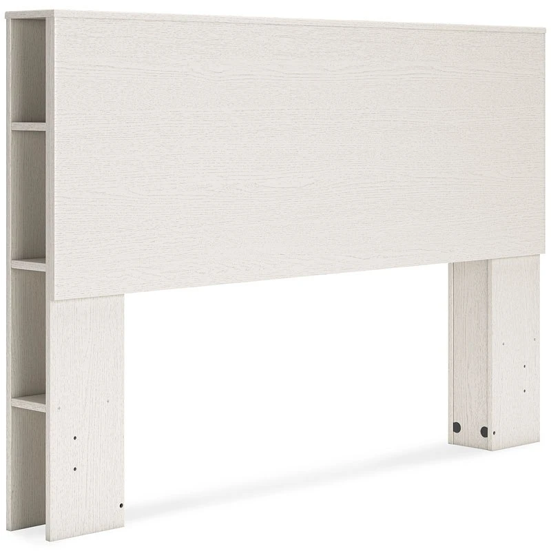 - OverviewDare to take minimalism to the max. This Aprilyn Bookcase Bed by Signature Design has an air of sleek simplicity thanks to its white painted finish with subtle replicated wood grain. A space-efficient storage option, cubbies along the side of the headboard ensure you can keep your favorite reads within reach. USB charging keeps up with your high-tech lifestyle. There’s no doubt about it: This contemporary piece is sure to become a classic.