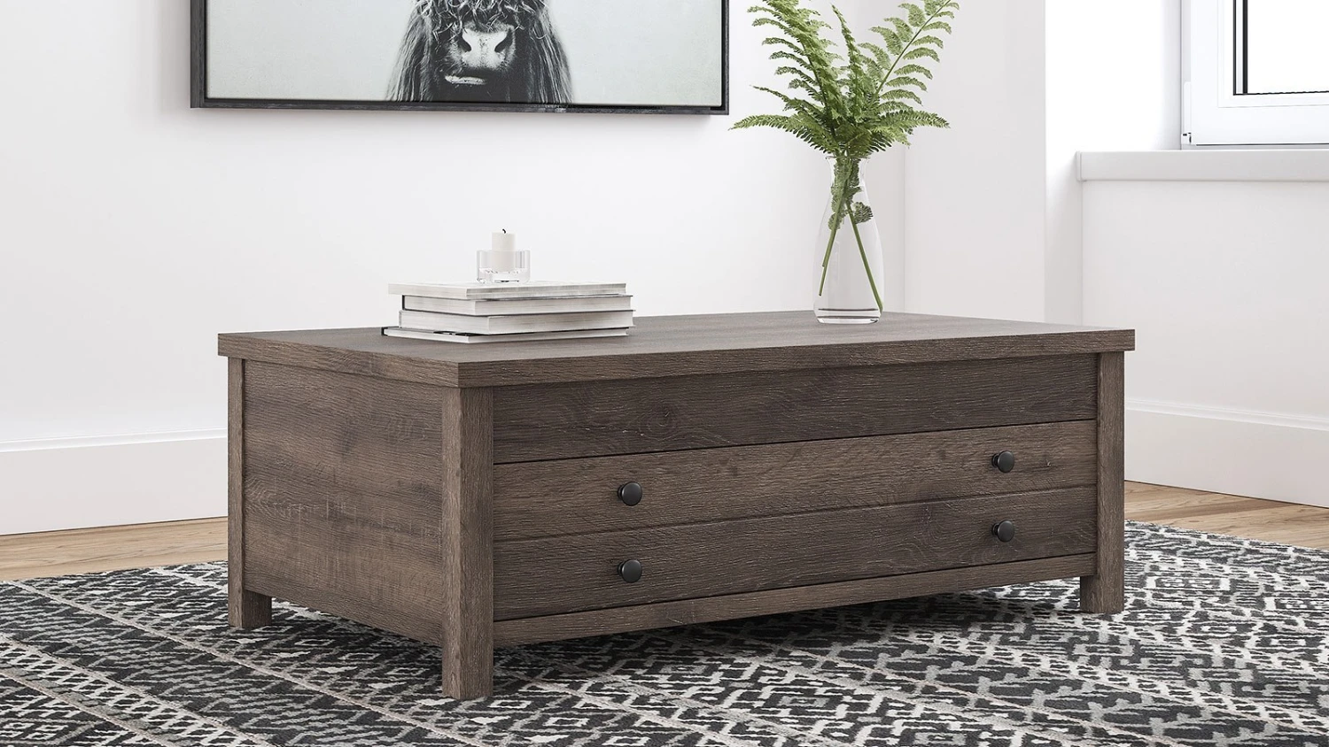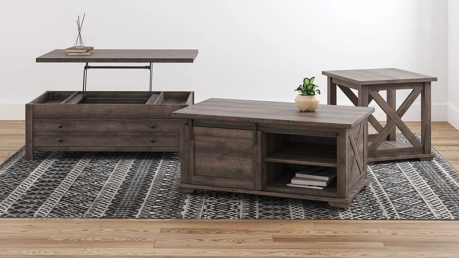 - OverviewRaise the bar on modern farmhouse design with this versatile Arlenbry lift-top coffee table by Signature Design. Sporting a handsome weathered oak effect and cross buck design, this table’s handy spring-loaded mechanism brings the tabletop closer to you. This versatile table makes it easier than ever to eat, work or play from the comfort of your sofa.