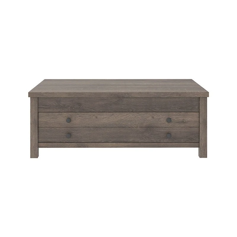 Lift top cocktail table has a spacious lower drawer and two concealed storage bins under the top for added function
