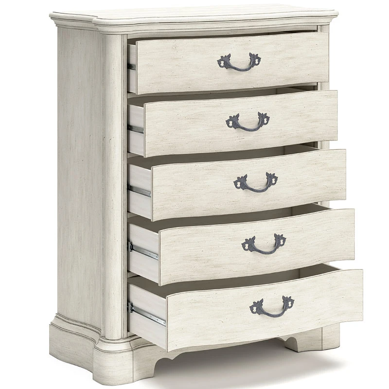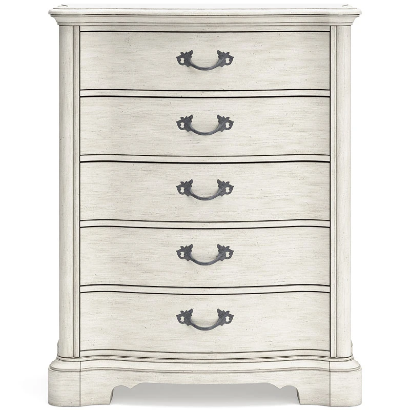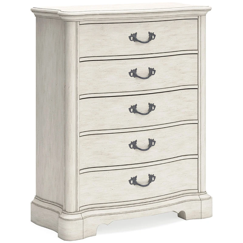- OverviewAdd a touch of romance to your bedroom with this Arlendyne Chest by Signature Design. Its antiqued white painted finish and serpentine-shaped silhouette details are the picture of easy elegance. Five spacious drawers offer ample storage space, while custom-designed bar pulls add originality.
