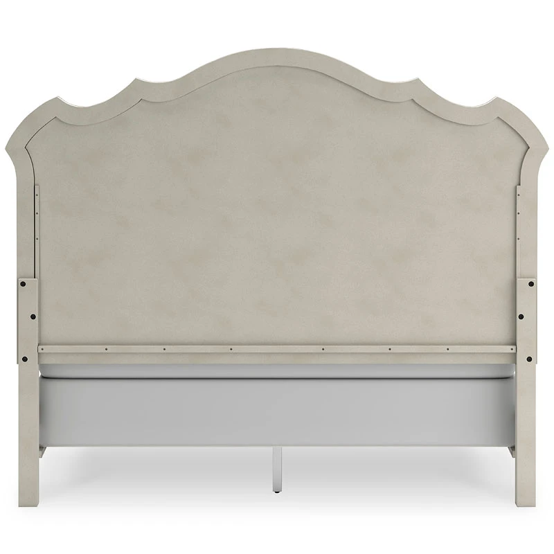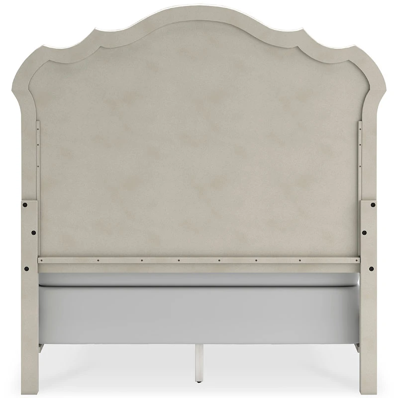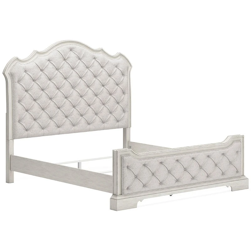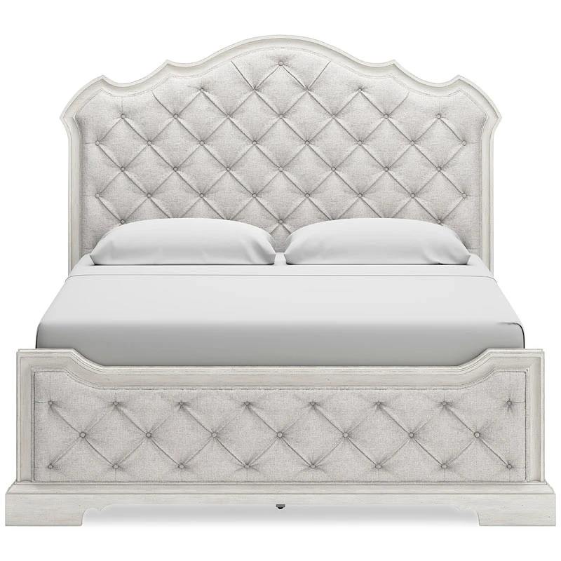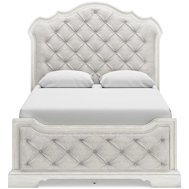 - OverviewAdd a touch of romance to your home with this Arlendyne Upholstered Bed by Signature Design. The antiqued white painted finish and serpentine-shaped silhouette details are the picture of easy elegance. Indulge your love of luxury with decadent button-tufted cushioning from head to toe.