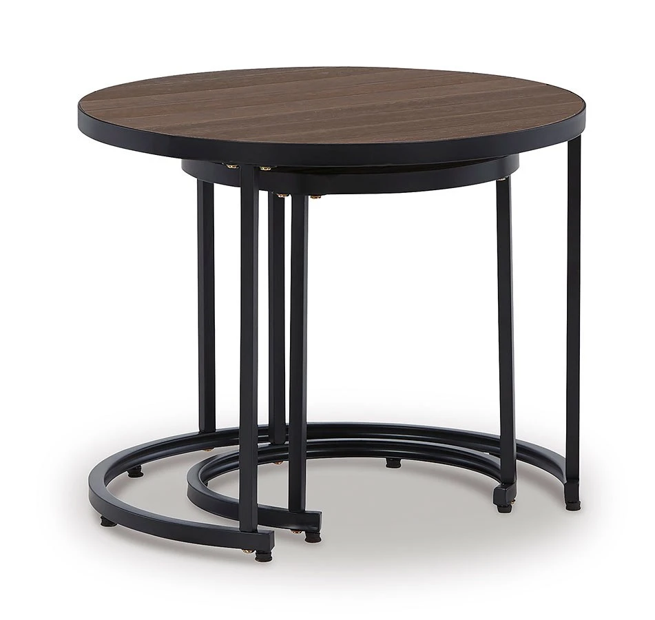 - OverviewIf you love a cool, on-trend look with elements of rustic warmth, you’ll find these Ayla Outdoor Nesting End Tables by Signature Design beautifully on track. Their black metal bases have the modern angle covered, while wood-look resin tabletops incorporate a homey feel rich with grainy appeal.