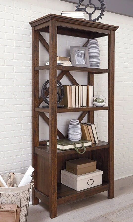 - OverviewLeaning toward a casually cool look with a touch of rustic industrial flair? This brilliant Baldridge Large Bookcase by Signature Design takes a fresh stance on style. Clean-lined profile with crossbuck back is complete with saw marks for the distinctive character.
