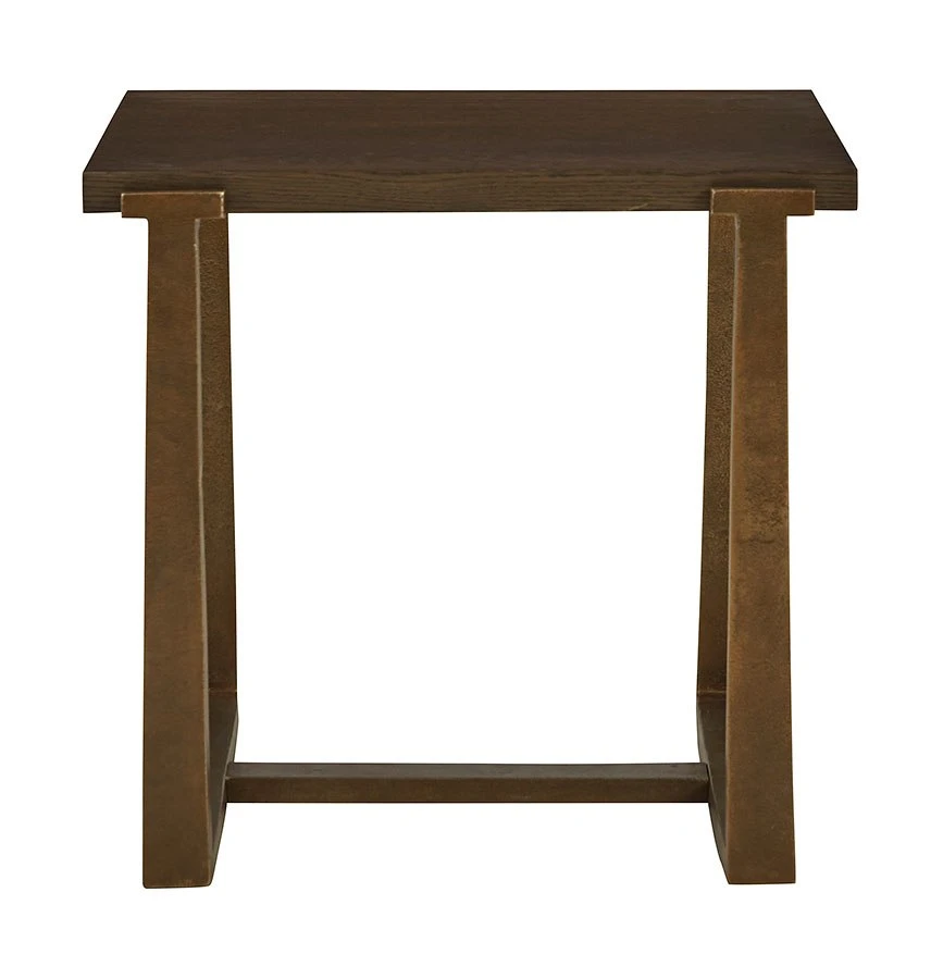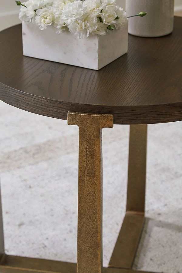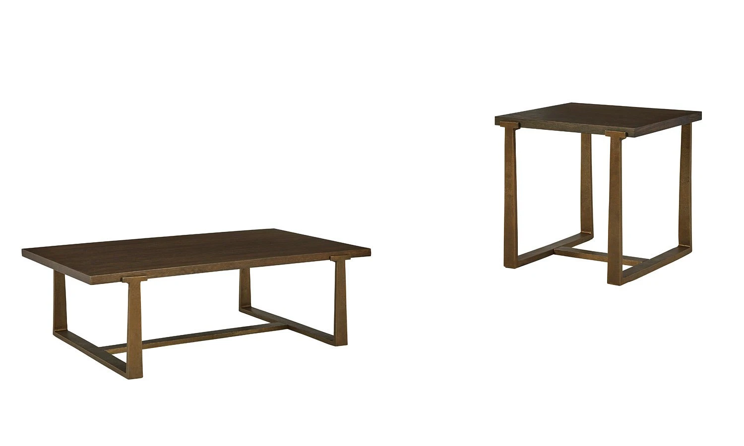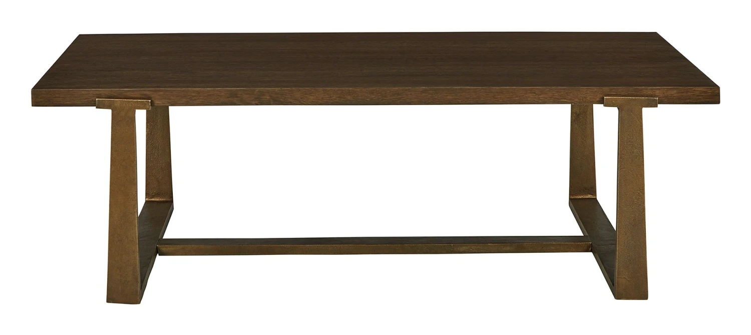 - OverviewChic and sleek, this Balintmore coffee table by Signature Design satisfies your taste for contemporary design. Its warm brown top is neutral and refined, while the antiqued goldtone base adds textural character. Place your favorite decorative accents on top to transform your living room into a curated modern masterpiece.