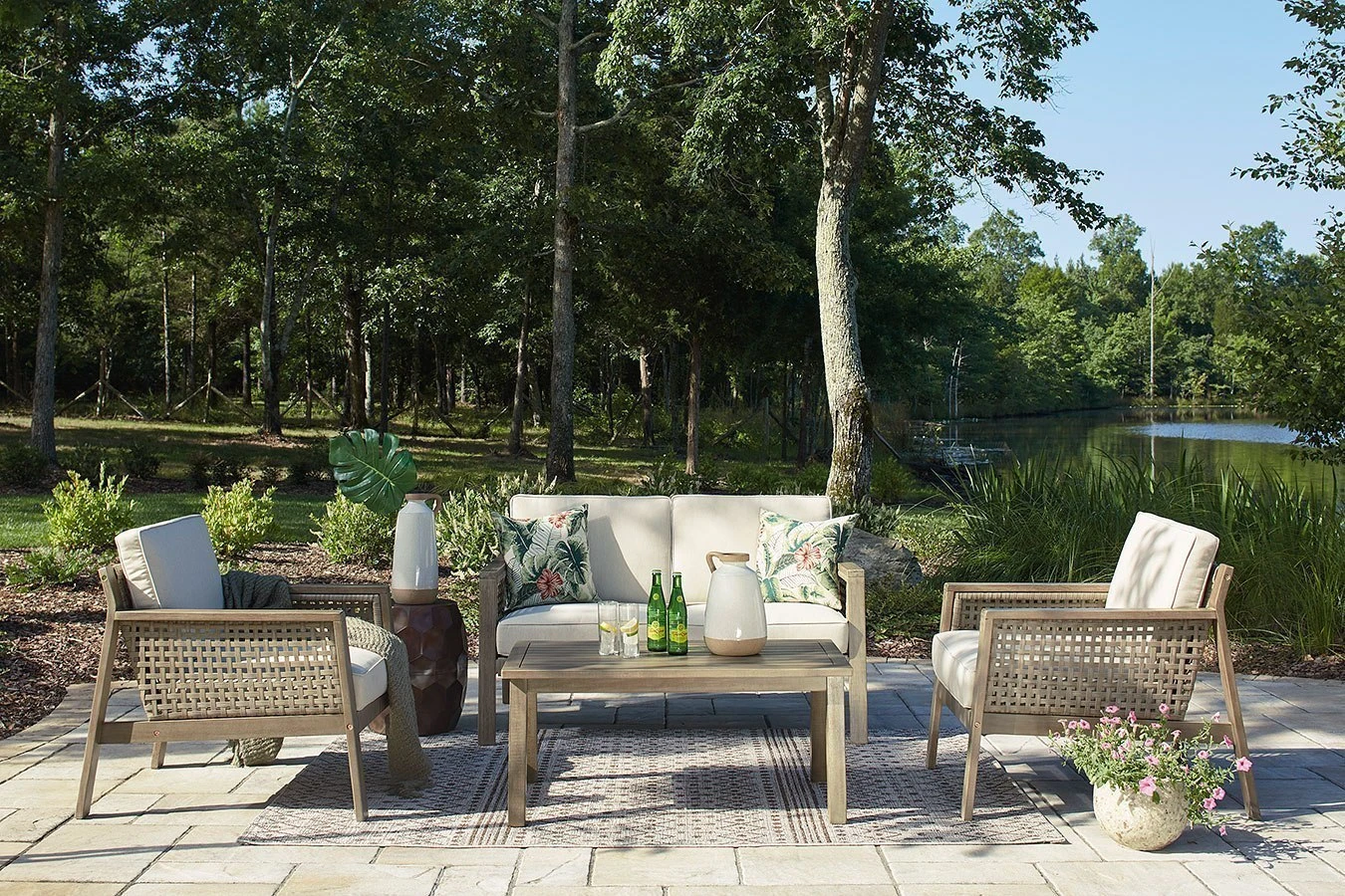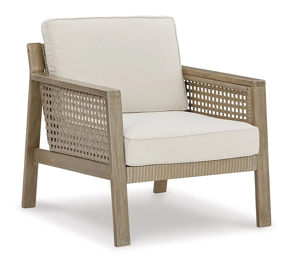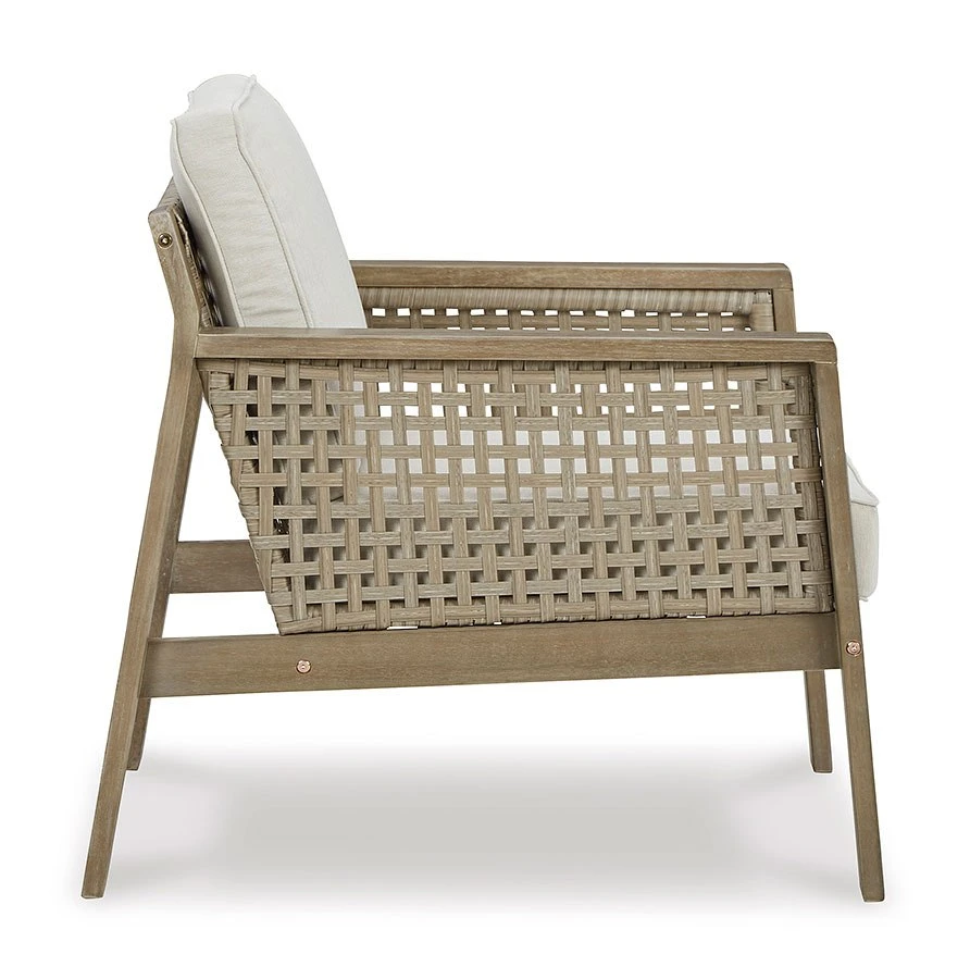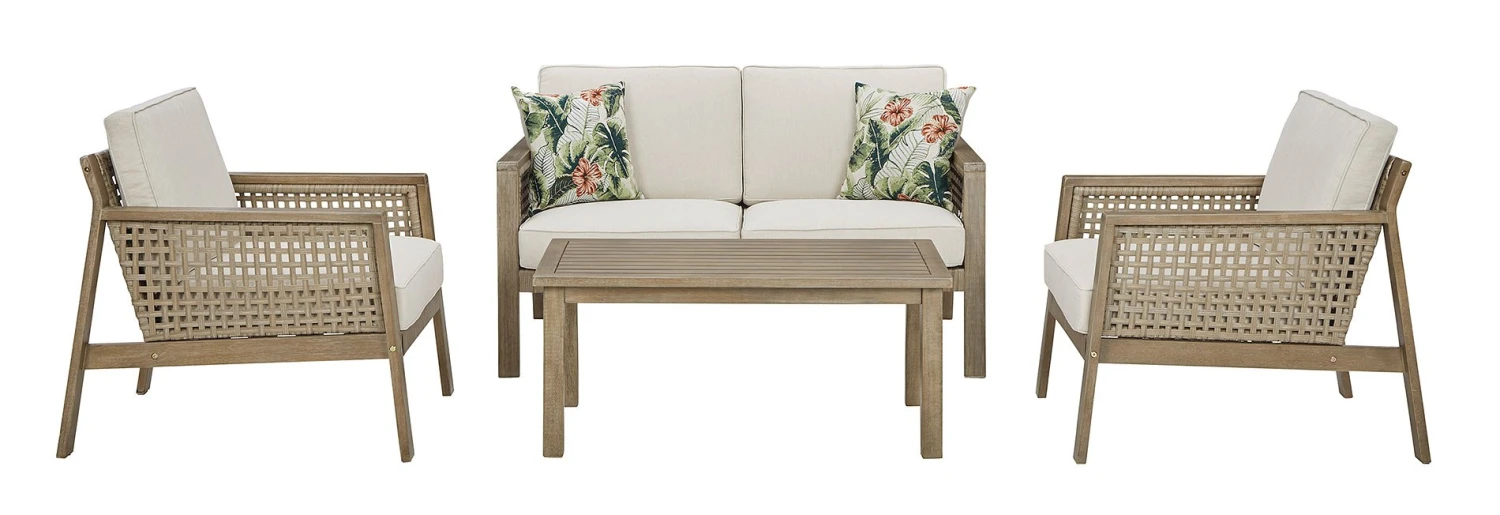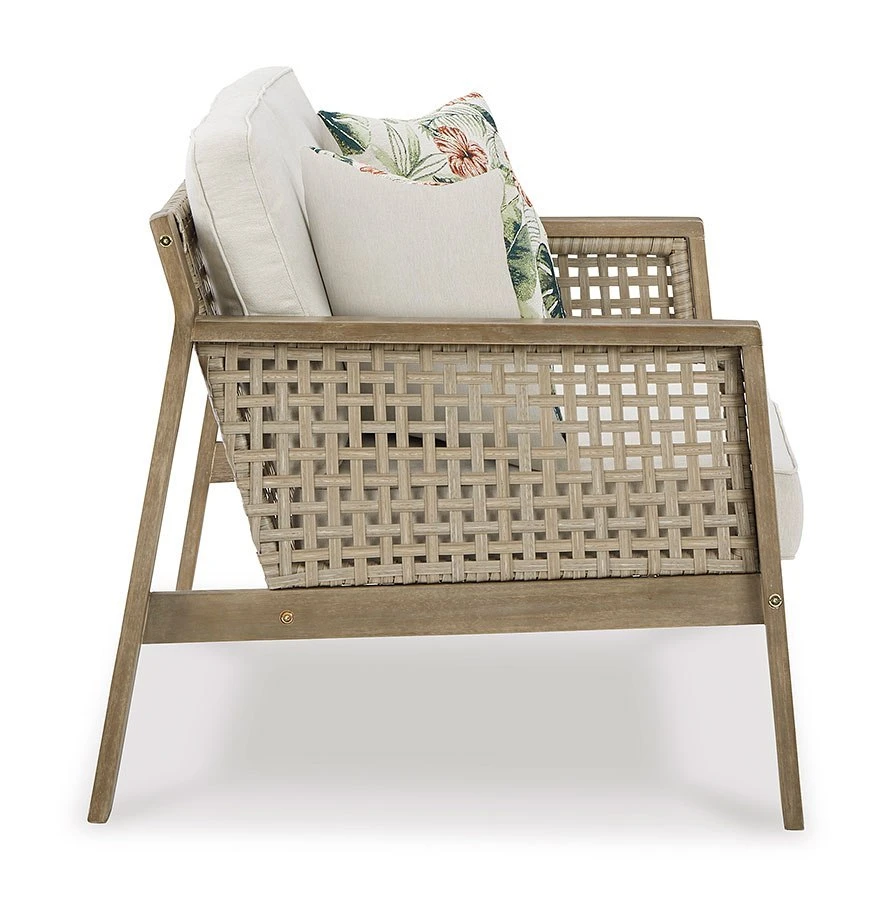- OverviewYou’ve got it made in the shade with this Barn Cove Outdoor Seating Set by Signature Design. Made with eucalyptus wood, the loveseat’s seat, back and sides are woven of durable resin wicker. The tan cushion is wrapped in easy-clean Nuvella fabric, which stands up to harsh weather for season after season of enjoyment. Two floral throw pillows add a splash of color.