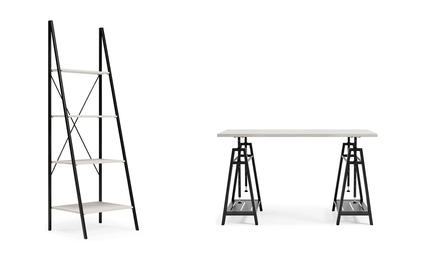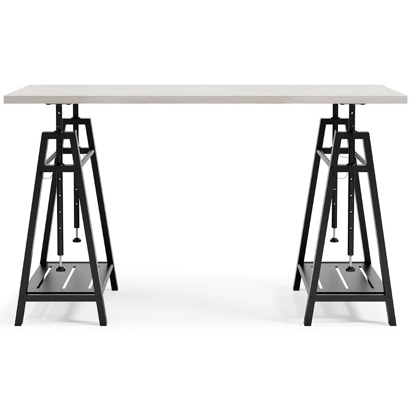 - OverviewLove an urban farmhouse aesthetic? Make it work to your advantage with this beautifully styled Bayflynn home office desk by Signature Design. A simply striking choice in home office furniture, it has an unmistakable farmhouse feel thanks to design elements including a whitewashed finish and gunmetal accents, this sawhorse adjustable height desk is right on trend. Whether you’re sitting, standing, typing or crafting, you’re sure to love the sawhorse desk’s unique 8-level adjustable height feature.