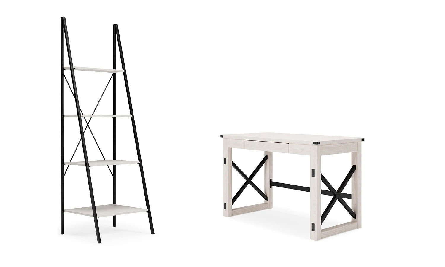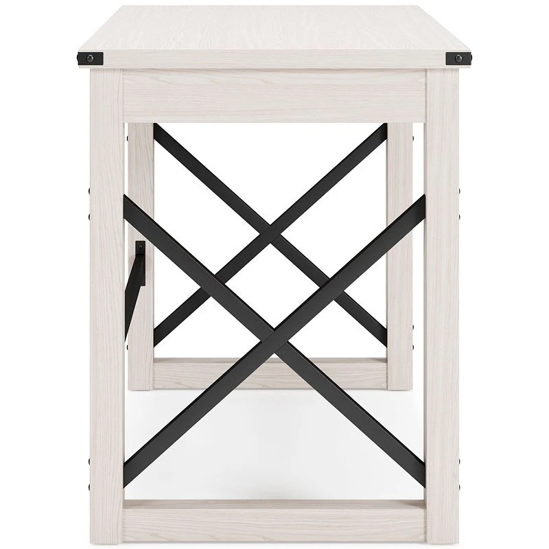 - OverviewLove an urban farmhouse aesthetic? Make it work to your advantage with this beautifully styled Bayflynn Desk by Signature Design. This simply striking choice in home office furniture has an unmistakable farmhouse feel thanks to design elements including a whitewashed decorative wood grain laminate contrasted with cross-buck rails, metal accents and a stretcher in black. Perfect for office supplies, the desk includes a handy center drawer with hardware-less aesthetic to help keep your desk top clutter free.