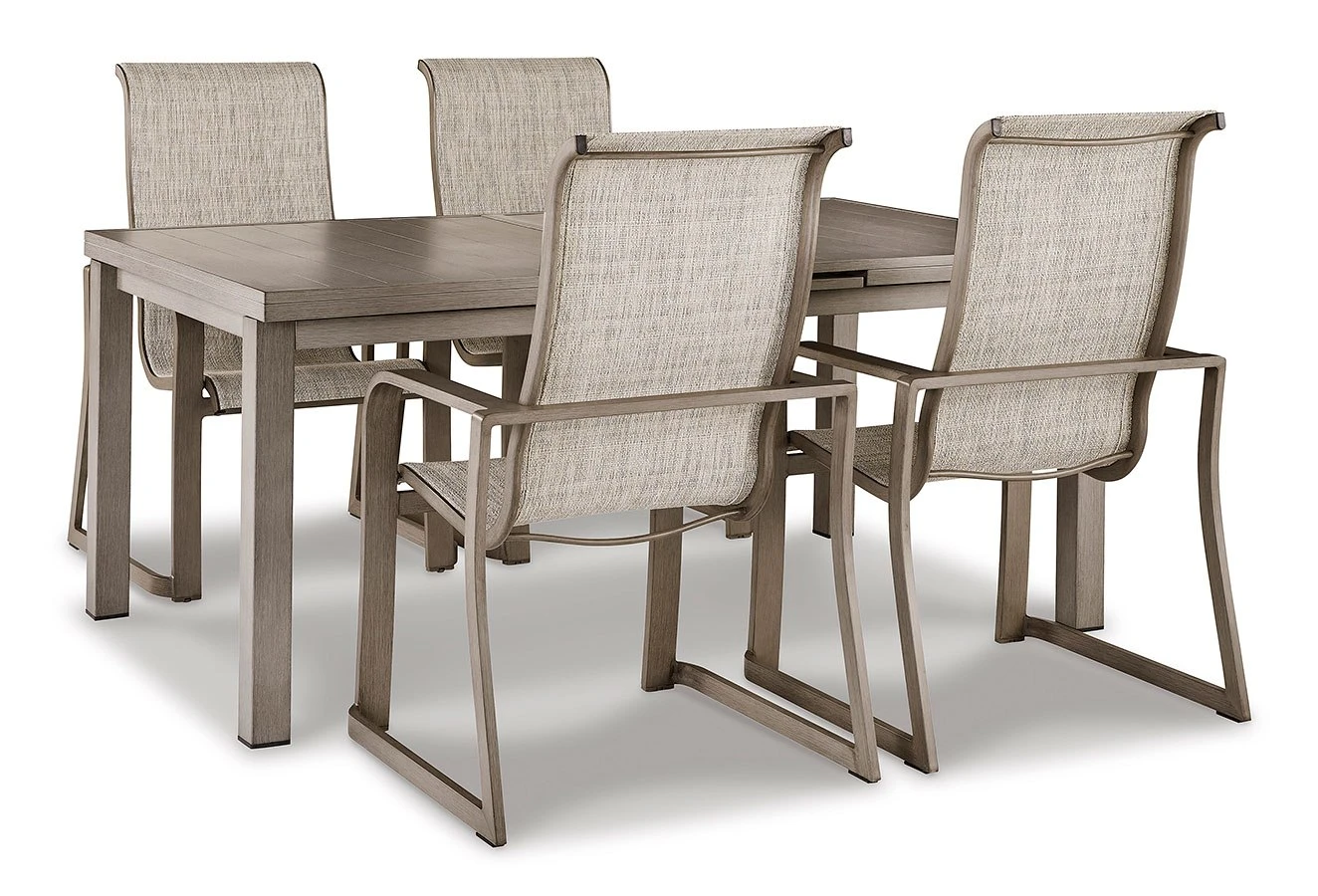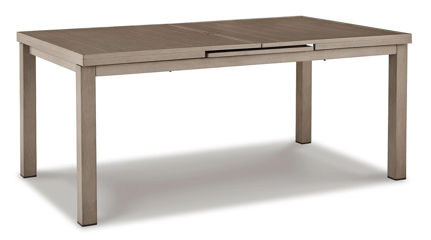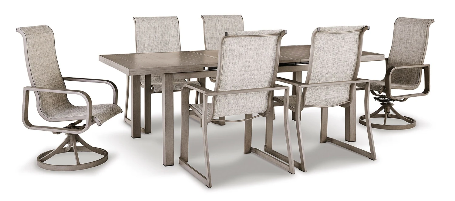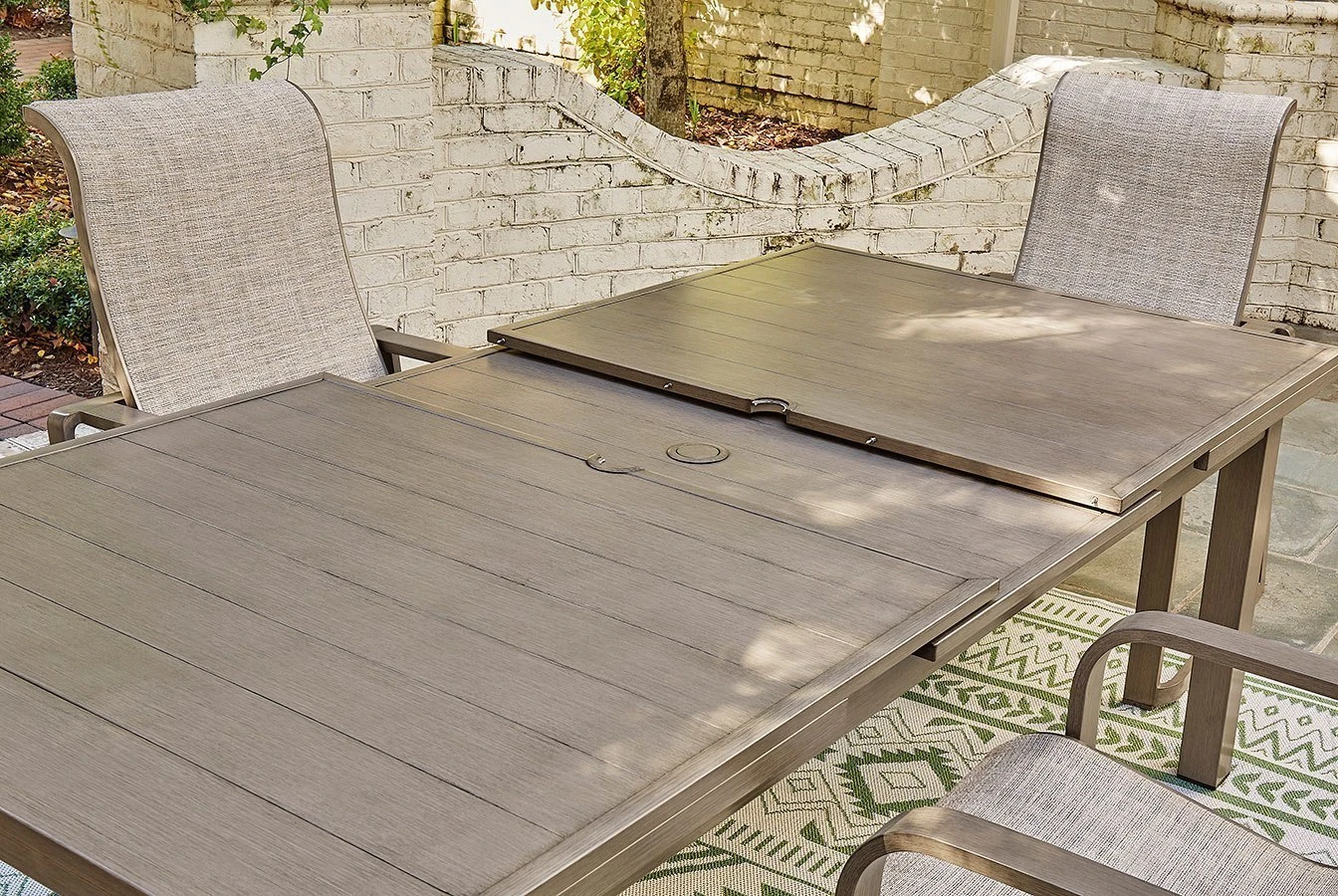 - OverviewBalancing effortless natural beauty and minimalist design, this Beach Front Outdoor Dining Set by Signature Design seamlessly brings your contemporary style outdoors. Sporting a wood-look finish, it entices with an extension feature that easily expands the table to provide additional space. This sleek yet durably made piece refines the art of relaxed outdoor living.