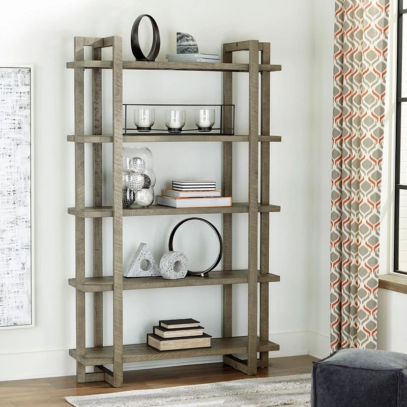 - OverviewClean-lined with an architectural attitude. This Bergton Bookcase by Signature Design offers a new take on relaxed refinery. Five shelves provide plenty of space for your personal library or decorative pieces. Dressed in a distressed gray finish, it suits a myriad of modern and casual color palettes.