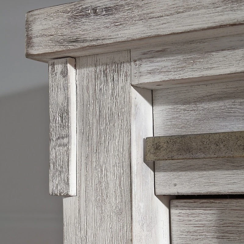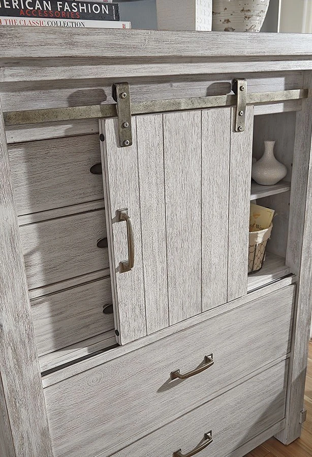 - OverviewThe Brashland chest of drawers by Signature Design brings a fresh twist to the modern farmhouse movement. Handsome, hearty profile is made all the more interesting with a sliding “barn door” revealing shelved storage. Through-tenon styling incorporates a welcome touch of American craftsman. And the easy on the eyes, distressed white finish? Just the tone for a soothing, serene bedroom retreat.