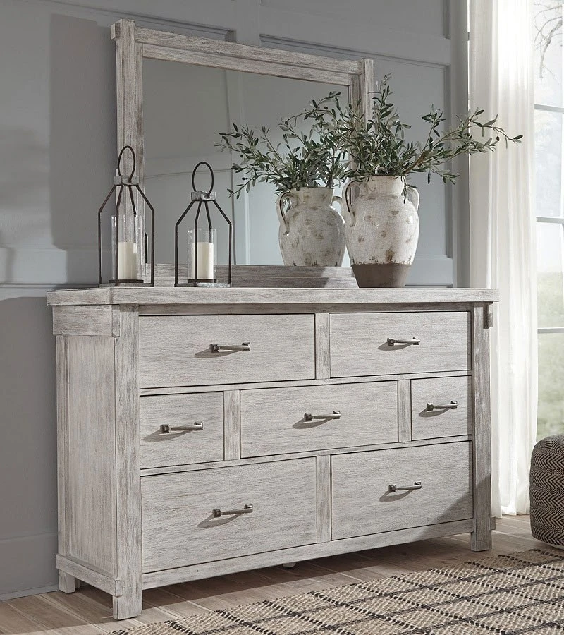 - OverviewThe Brashland dresser by Signature Design brings a fresh twist to the modern farmhouse movement. Handsome, hearty profile is made all the more interesting with a staggered drawer layout. Through-tenon styling incorporates a welcome touch of American craftsman. And the easy on the eyes, distressed white finish? Just the tone for a soothing, serene bedroom retreat.