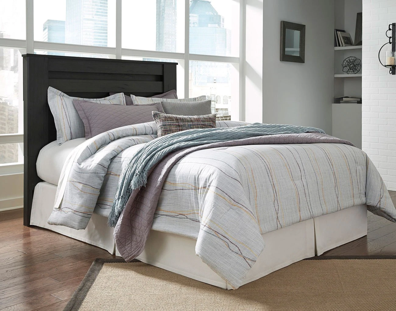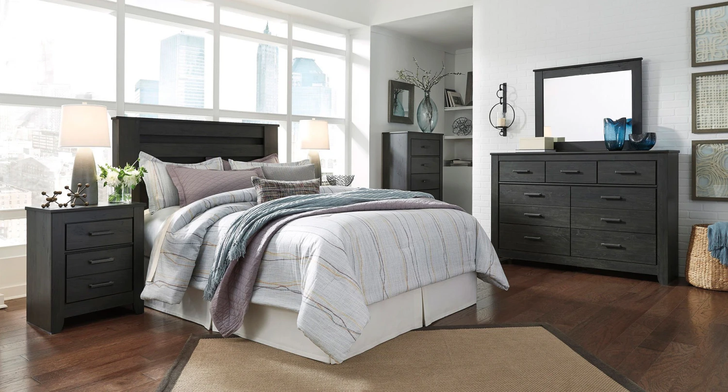 - OverviewPriced to entice and styled to impress, the Brinxton Bedroom Set by Signature Design is urban sophistication with a decidedly relaxed air. It’s got the crisp, clean lines of contemporary pieces, but with an earthy element. Replicated oak grain effect gives the chic charcoal finish warmth and character. Linear pulls are a sleek touch.
