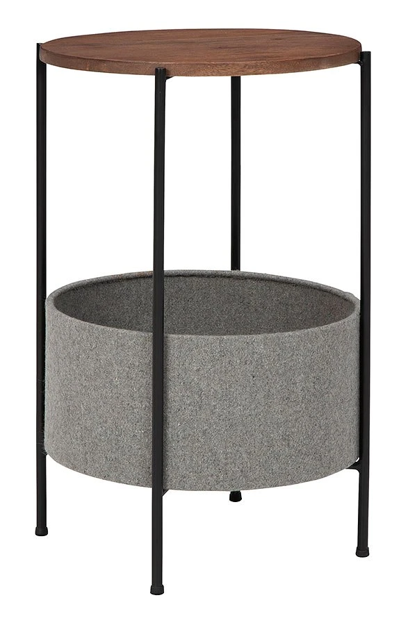 - OverviewThe casual display and storage solution you’ve been looking for, this accent table is the perfect finishing touch for any room. Wood with a medium brown finish adds warmth, while the black finished metal keeps things sleek and simple. With the included light gray felt storage basket, you can keep clutter controlled.