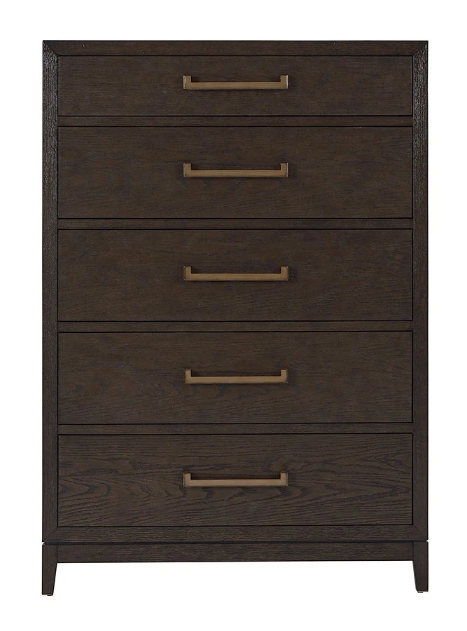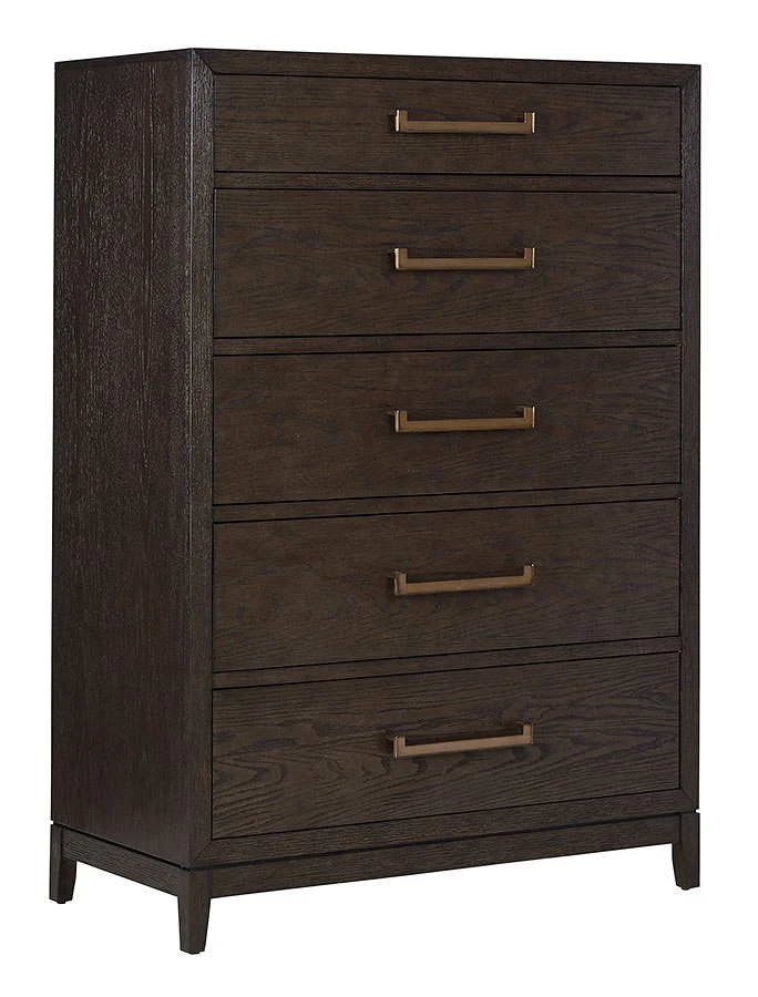 - OverviewDressed to thrill, this simply stunning Burkhaus chest by Signature Design offers a high-design look at a down-to-earth price. Ultra sleek lines are accentuated with a dark waxy brown oak-tone finish that’s so easy on the eyes. Elongated drawer pulls emphasize the dresser’s clean, modern lines, while their brass-tone finish completes the upscale aesthetic. Beautiful from the inside out, its smooth-gliding, flush-fit drawers are crafted with quality dovetail construction – for a timeless look that’s made to last.