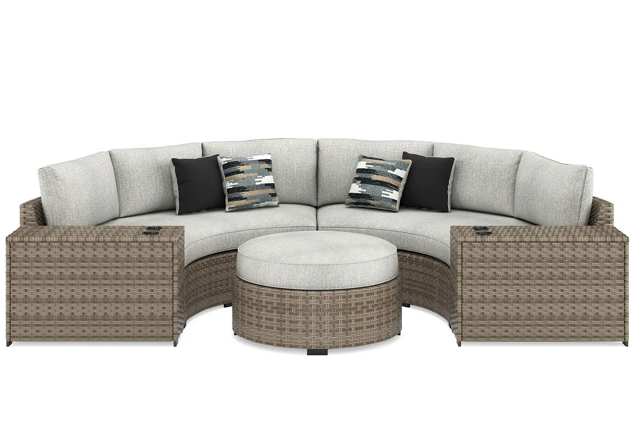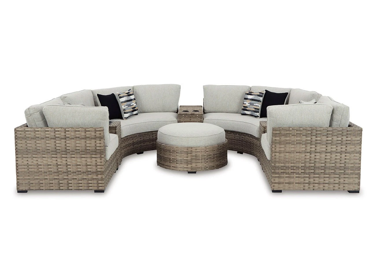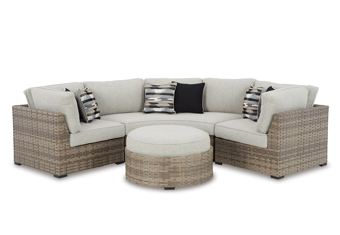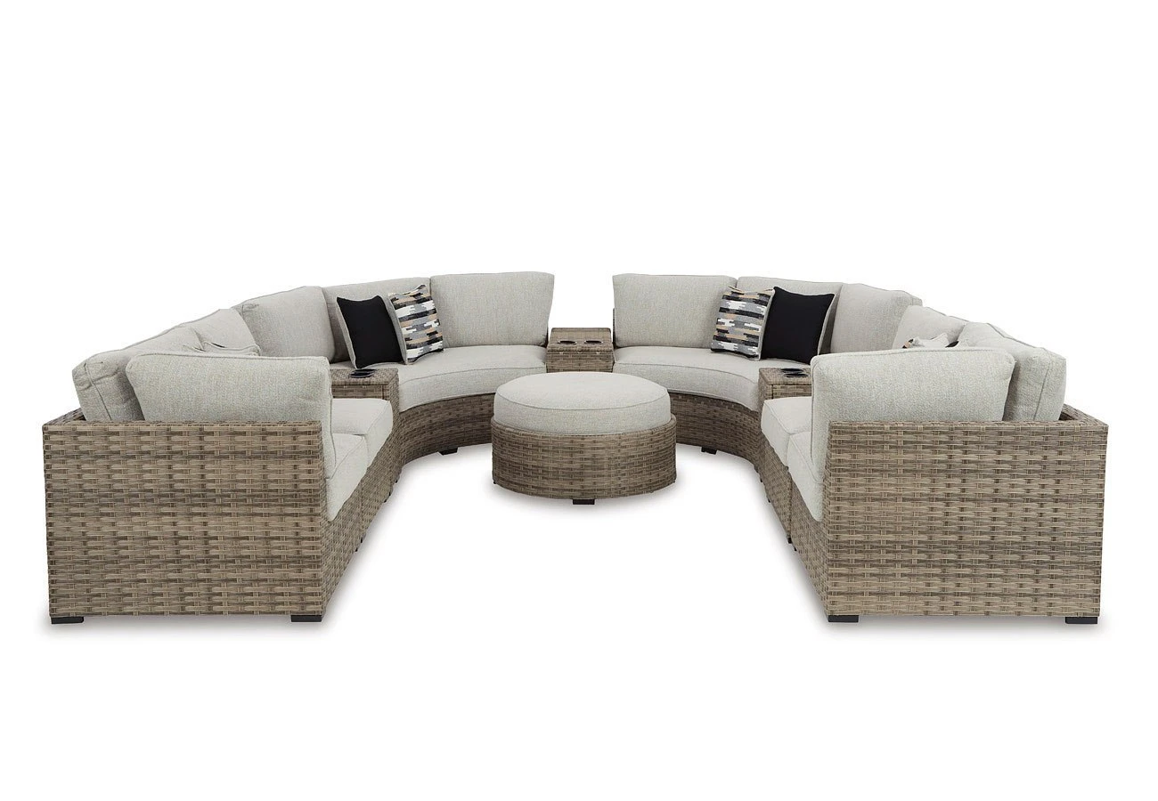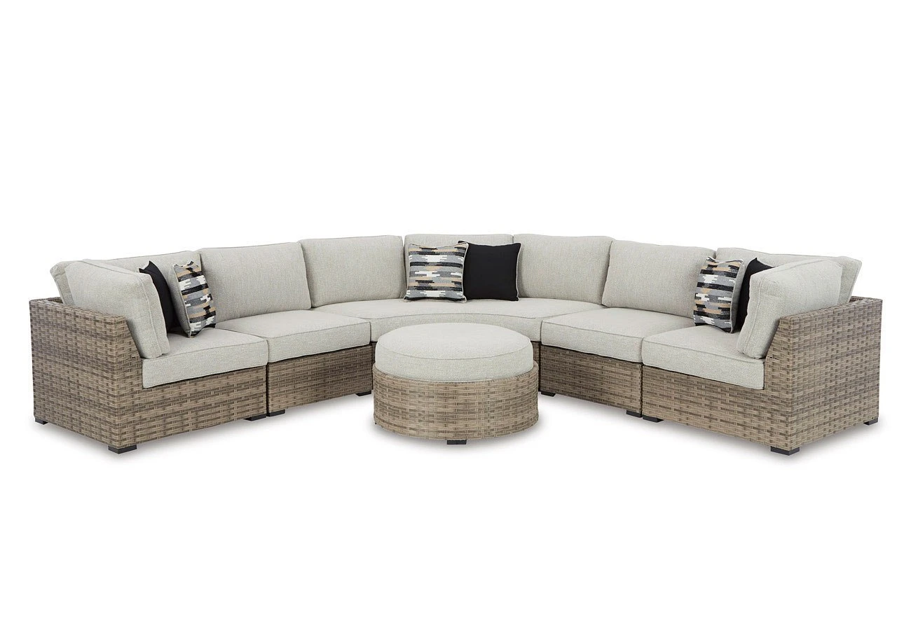 - OverviewThis cool, casual Calworth Outdoor Sectional by Signature Design will raise the comfort level and visual appeal of your outdoor living space. Made of handwoven wicker in easy-going beige tones, the sectional blends beautifully into your lanai or pool and patio area with thick, comfy cushions wrapped in Nuvella high performance fabric that is stain resistant, fade resistant and easy to clean. The modular design can be reconfigured to suit your needs and keep a fresh look. Throw pillows are included for added comfort and a splash of color.