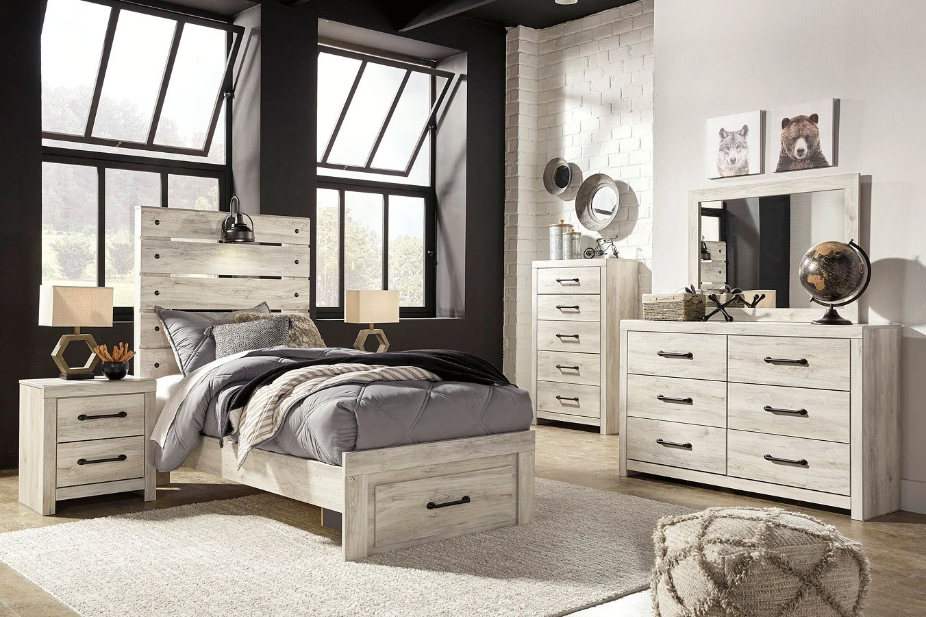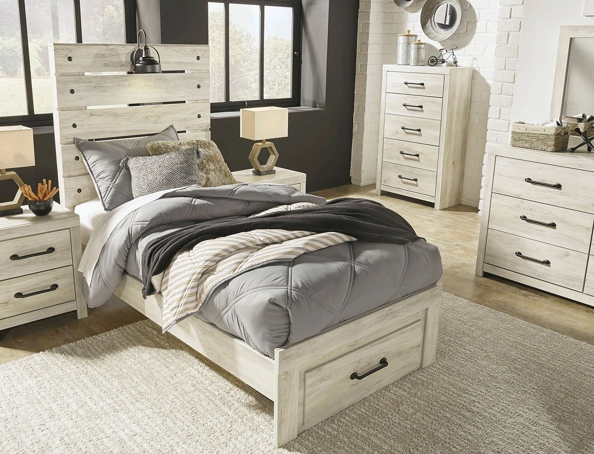 - OverviewWhat a delightful take on rustic industrial style. Whether modern loft or modern farmhouse, this Cambeck Bedroom Collection by Signature Design makes itself at home. The wispy whitewash palette enhances without covering the grain for that weathered look you crave. Love to read in bed? You’re sure to find the retro-chic light sconce and USB plug-ins on the open-slat style headboard such a bright idea.