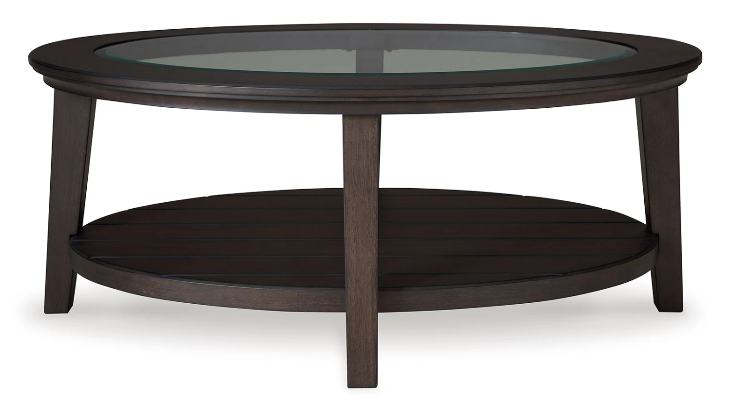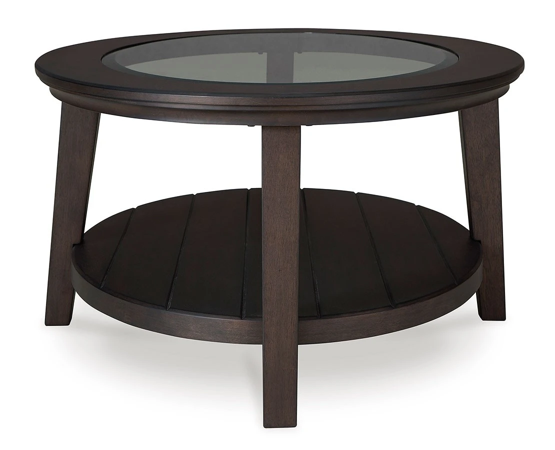 - OverviewIf you’re looking for an accent piece with traditional elements that also fit in modern farmhouse settings, you’ve found it. A rich finish bathes the canted legs and thick lower shelf of this Celamar Cocktail Table by Signature Design, adding a lovely dimension under the glass inset tabletop. Place it in front of your sofa and enjoy the timeless casual styling it brings to your home.