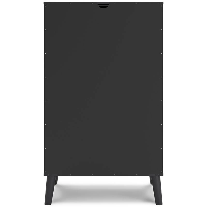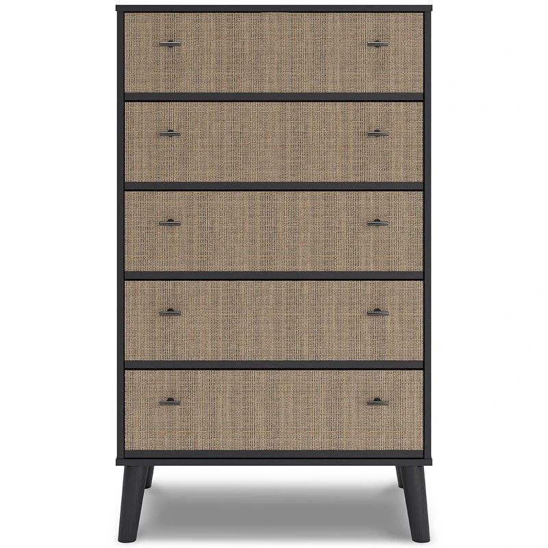 - OverviewPut a retro spin on current trends with this Charlang chest of drawers by Signature Design. Its mixed-material look of matte black and replicated beige cane brings a casually cool feel to your bedroom. Simple, sleek hardware and splay legs round out the urban meets mid-century vibe.
