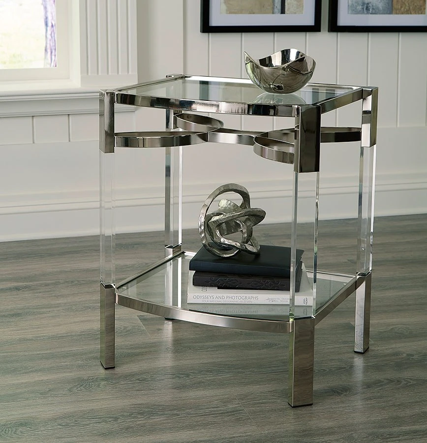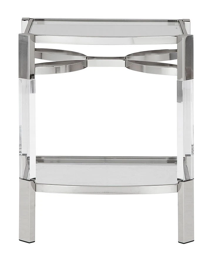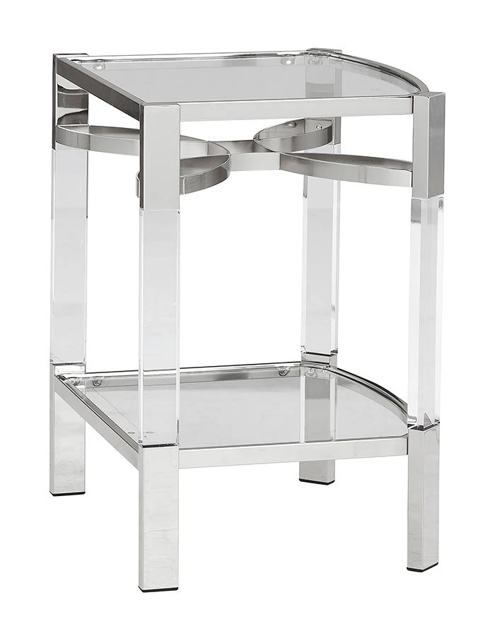 - OverviewIf you love the idea of total transparency, this accent table is surely a sight for sore eyes. Crafted of clear acrylic, the glass top and open glass shelf is beautifully on trend. Sleek chrome plated metal legs with clear acrylic accents add a touch of elegance to your mid-mod vibe.