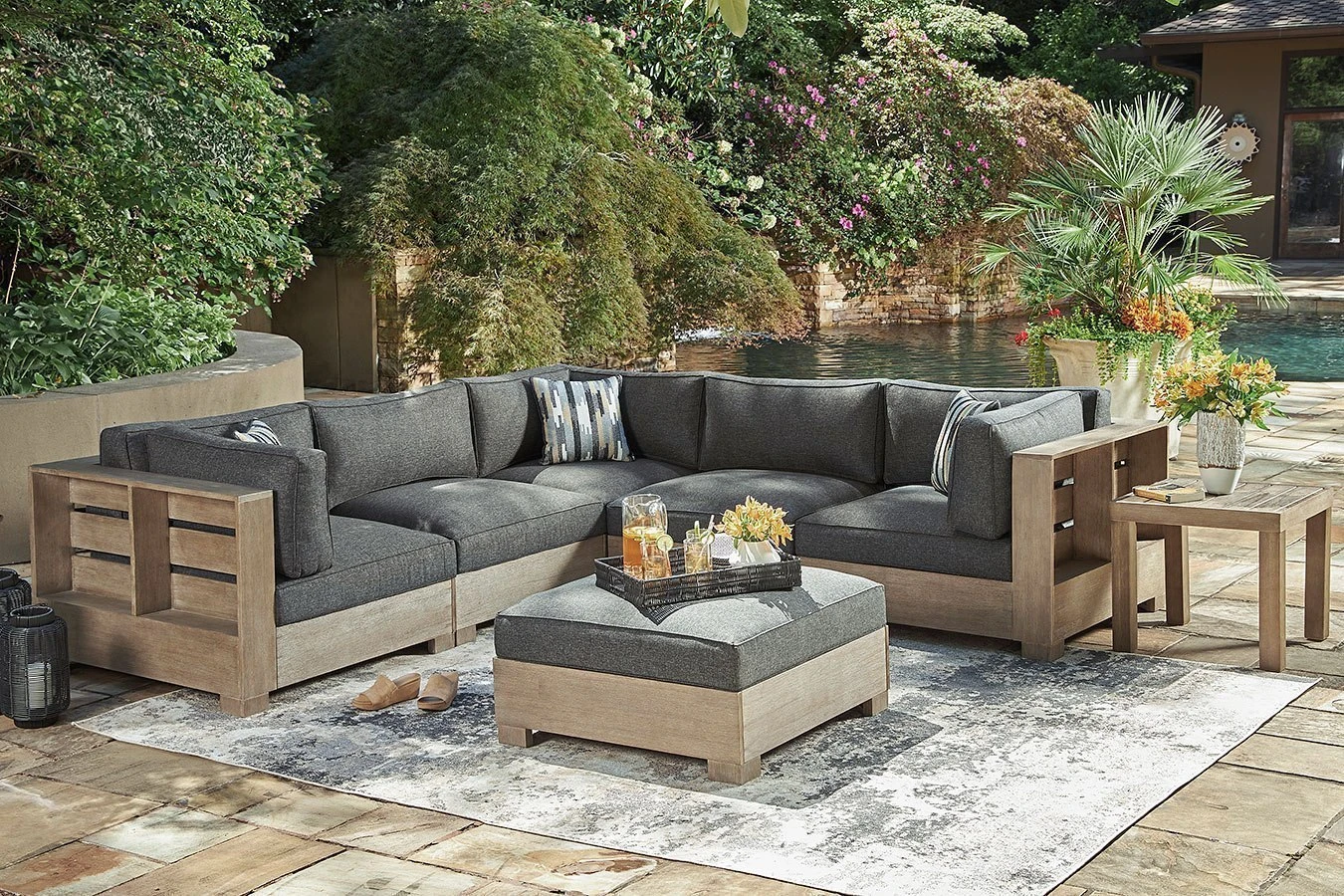 - OverviewBe the host with the most when you add this simply stunning Citrine Park Outdoor Sectional by Signature Design to your patio, porch or poolside. High-performance Nuvella Premium fabric in a dark neutral harmonizes with the eucalyptus wood frame to craft a richly relaxed sense of style, whether you’re hosting family and friends or lounging outdoors on your own.