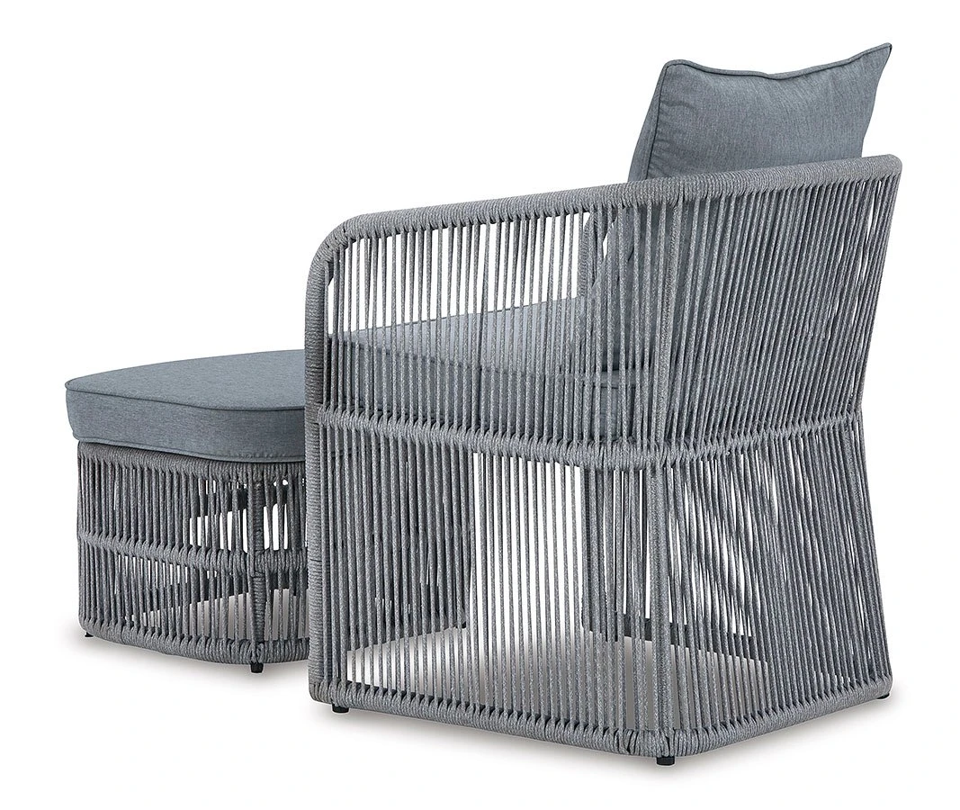 - OverviewOn-trend with its monochromatic design, this Coast Island outdoor chair with ottoman and side table by Signature Design is primed for casually cool relaxation. Gray rope material woven on a durable steel frame has a subtle-yet-dynamic sense of style. A tempered glass tabletop is the perfect place for drinks and snacks, while the self-storing ottoman offers a spot for tired feet to rest while you’re chilling alfresco. All-weather cushions, covered in easy-to-clean Nuvella fabric, round out the look.