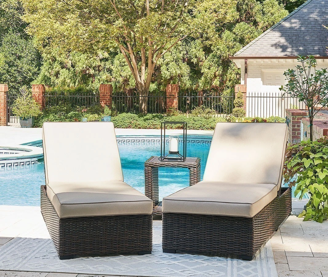 - OverviewWho says the great outdoors isn’t made for luxury living? This Coastline Bay Outdoor 3-Piece Chaise Lounge Set by Signature Design offers all the high-end design, plush comfort and durability you could ask for, and then some. Its all-weather, rust-proof aluminum frames provide the easy-breezy wicker look you love without the high maintenance. Rest assured, the high-performing Nuvella fabric is made to stand up to the elements.
