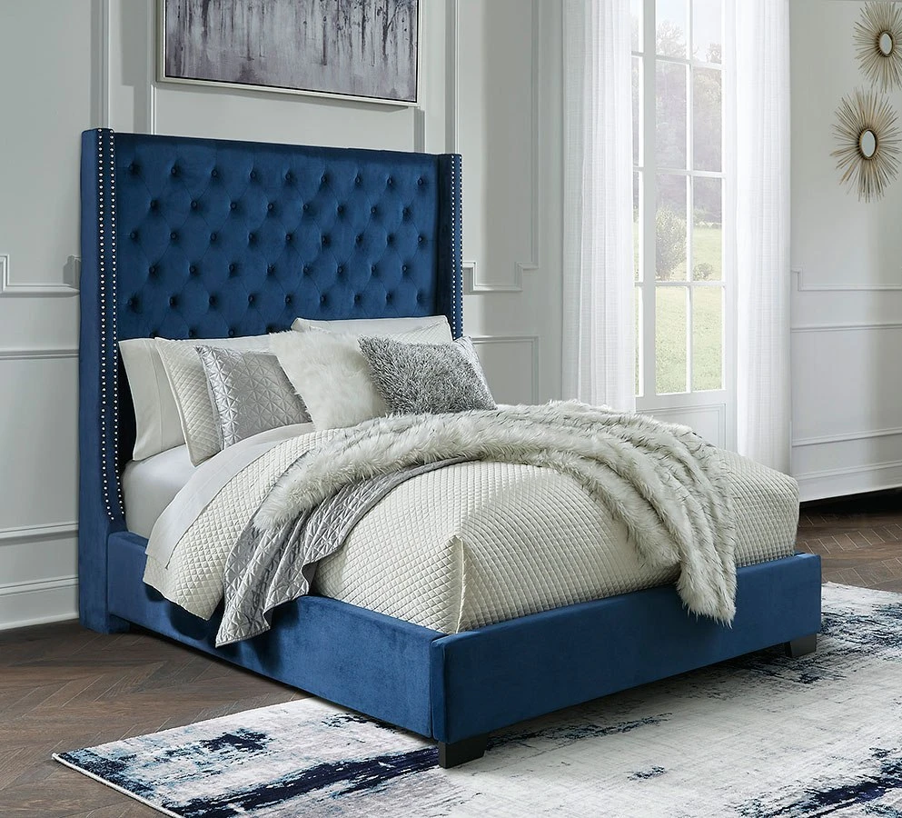 - Default Set Includes1 x Coralayne Blue Upholstered Bed (Queen) 1 x Coralayne Blue Upholstered Bed (King) 1 x Coralayne Blue Upholstered Bed (California King) 1 x Coralayne Nightstand