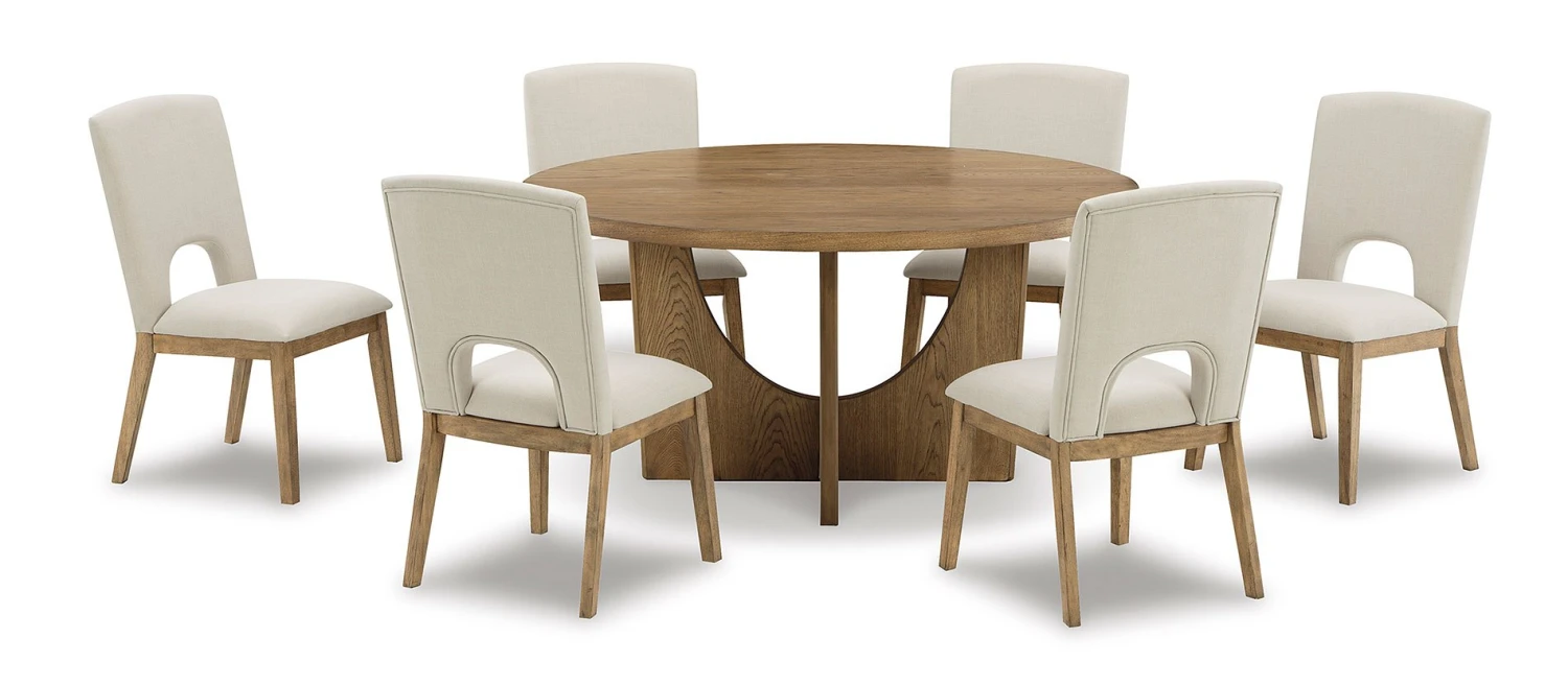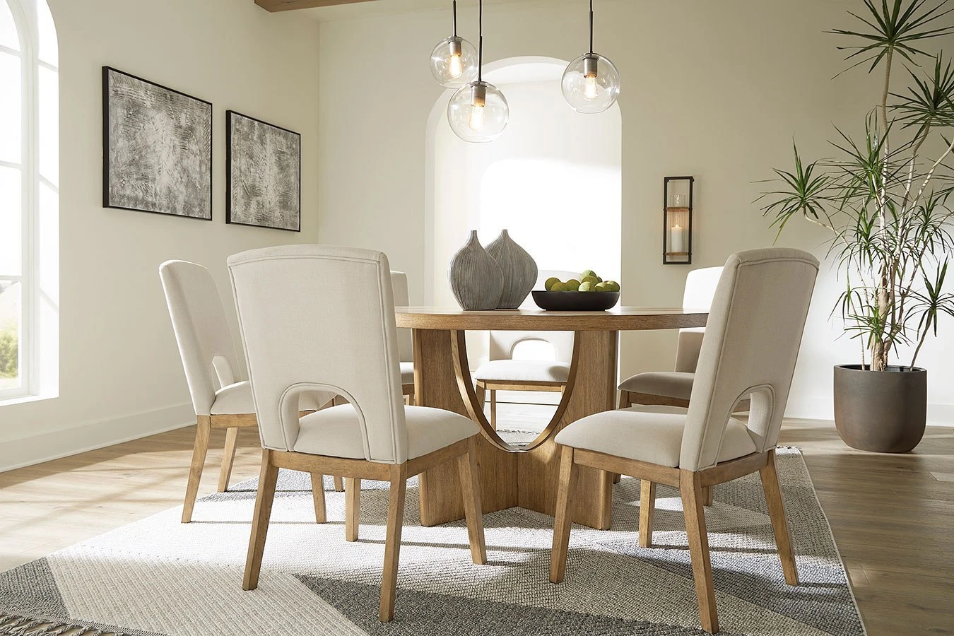 - OverviewTaking an organic approach to a curated dining room aesthetic, this warmly neutral Dakmore dining table by Signature Design has a natural appeal. The contemporary inspired design is highlighted with an effortlessly eye-catching geometric base. Whether it’s used for breakfast or family game nights, this piece elevates the everyday with its aura of casual refinement.