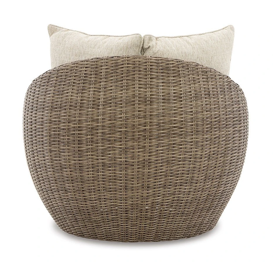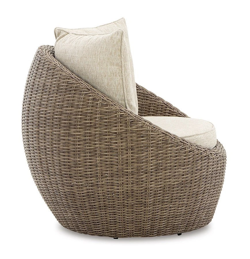 - OverviewThis Danson swivel lounge chair by Signature Design completes your outdoor seating area with its fresh take on casual comfort. Handwoven resin wicker over a curving aluminum frame balances streamlined style and exceptional durability. High-performance beige Nuvella Premium fabric wraps the seat and back cushions, protecting against the natural elements.