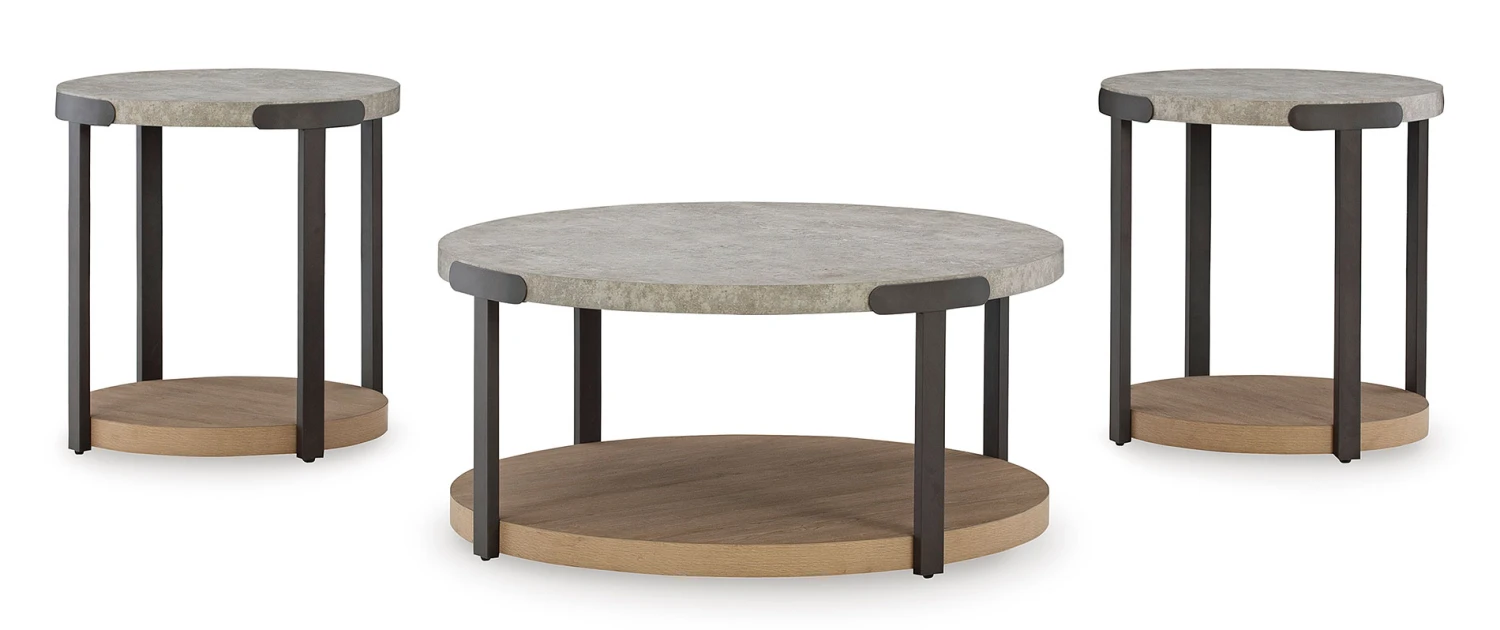 - OverviewA living room essential, occasional tables are perfect for keeping your snacks close and design books displayed. So why settle for a traditional design when you can mix it up a little? This Darthurst 3-Piece Occasional Table Set by Signature Design showcases a clean-lined round silhouette, founded atop an open shelf base with a light natural oak wood grain look. The thick tabletop adds modern appeal – perfect for placing in contemporary surroundings.