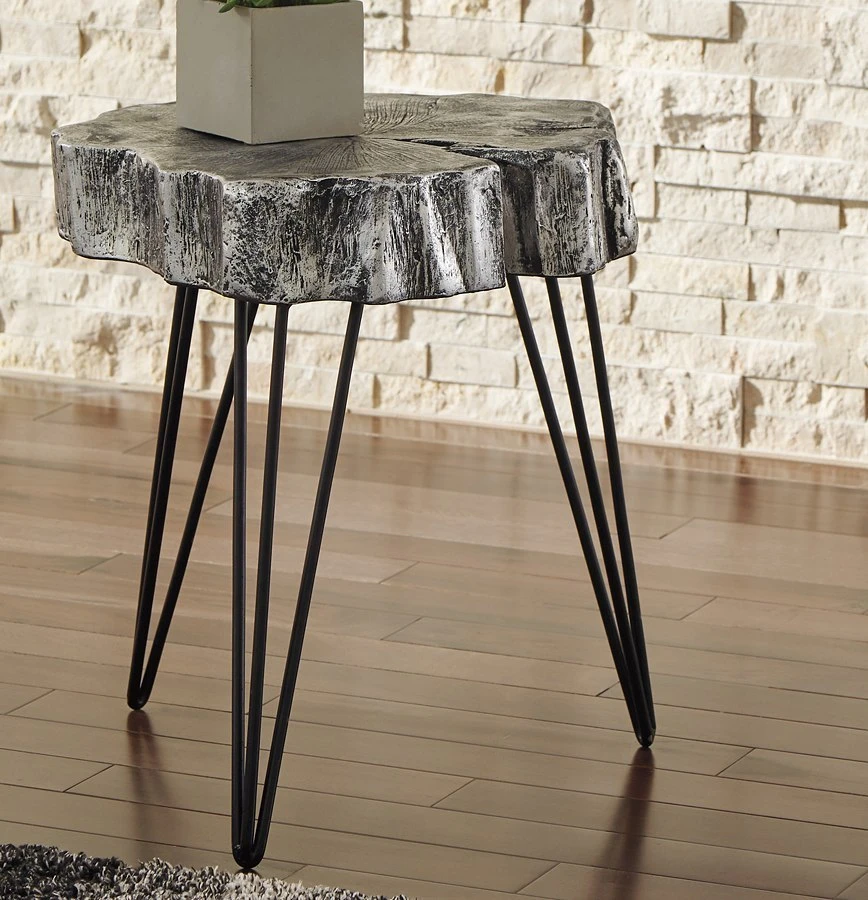 - OverviewHigh style faux real. A fresh twist on rustic refinement, the Dellman artificial wood slice Table by Signature Design by Ashley Furniture is a true standout. Antiqued silvertone finish gives its remarkably realistic tabletop cut-above flair.