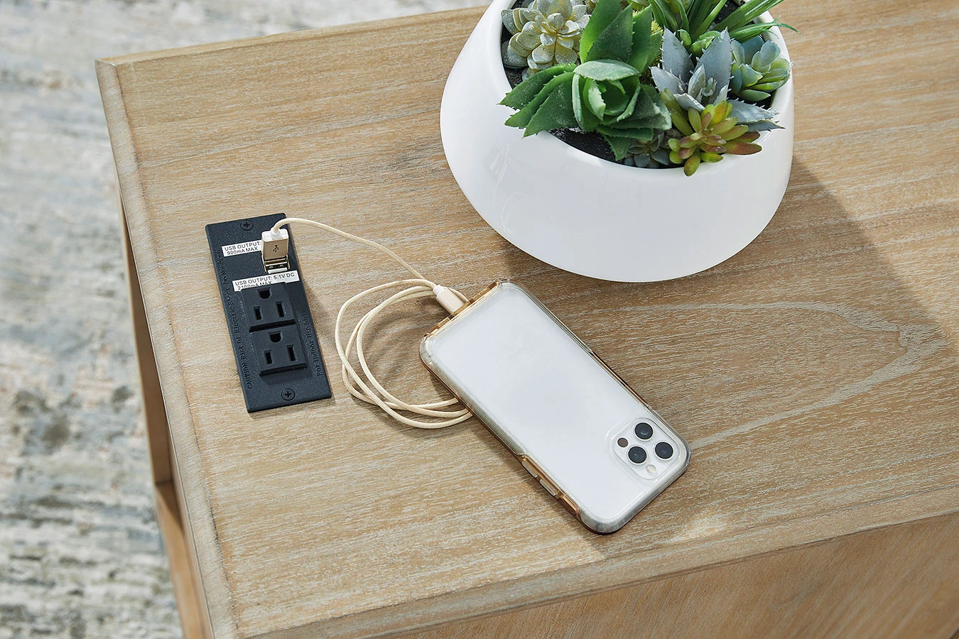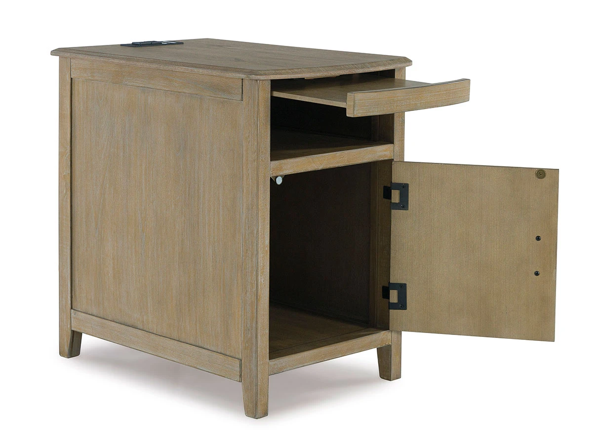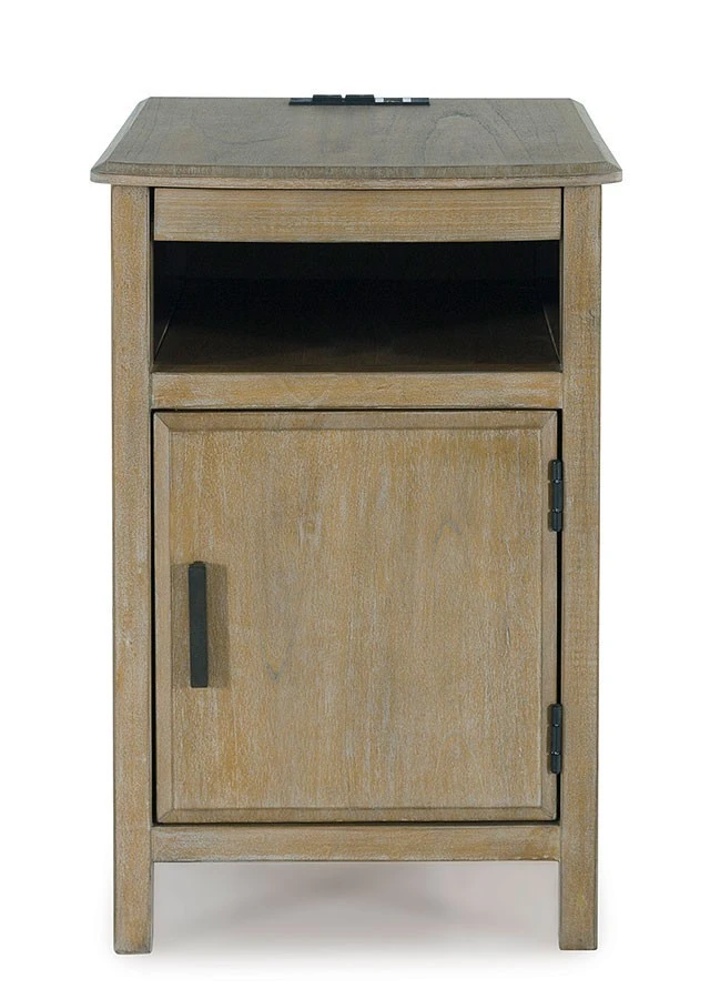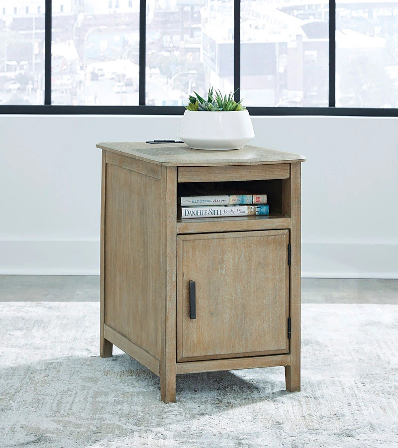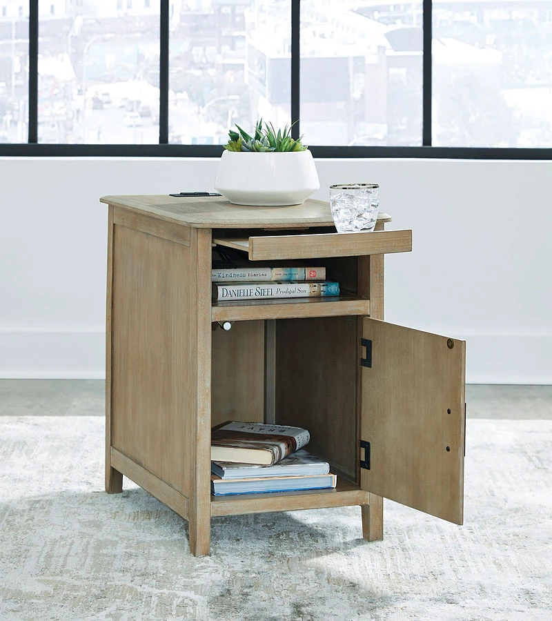 - OverviewThis Devonsted Chairside End Table by Signature Design is a simply stunning exhibition of sofa-side function. Your daily routines are upgraded with USB charging and a handy pull-out tray to keep remotes and beverages close at hand. Seeking extra storage? This table is ready to accommodate. Intentionally made for casual lifestyles, it’s an instant everyday essential.