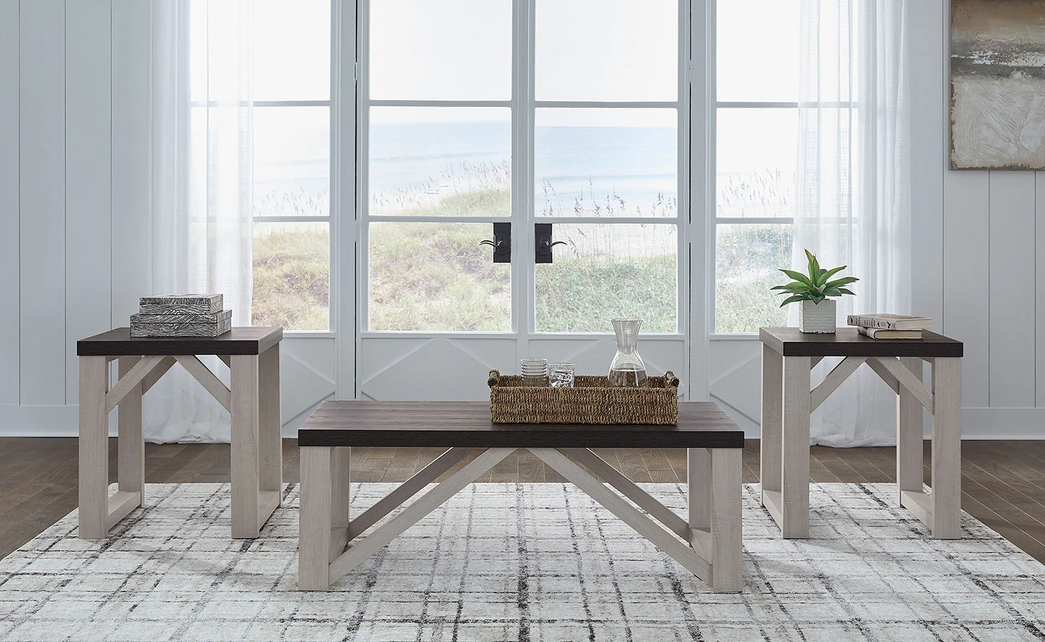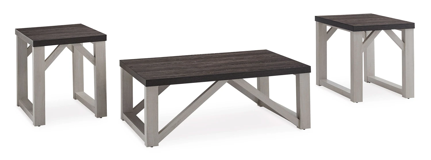- OverviewWith an antiqued finish, plank-effect styling and an angled brace design, the Dorrinson 3-Piece Occasional Table Set by Signature Design is sure to elevate the look and feel of a room. Whether you embrace cottage chic or fancy modern farmhouse decor, these tables will look right at home flanking a sofa or chair.
