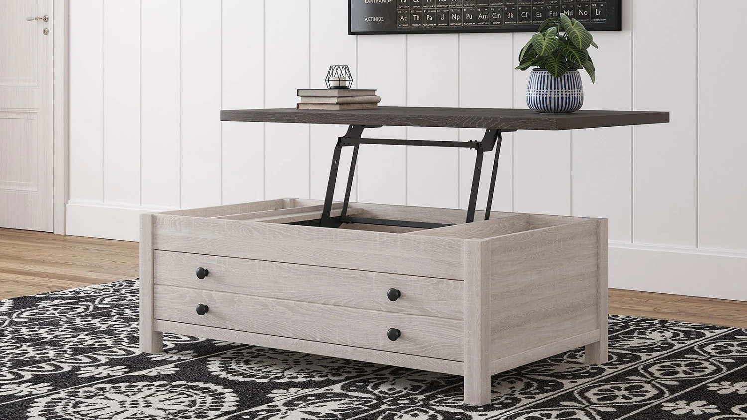 - OverviewRaise the bar on modern farmhouse design with this versatile Dorrinson lift-top coffee table by Signature Design. Sporting a two-tone, gray and antiqued white color scheme and cross buck design, this table’s handy spring-loaded mechanism brings the tabletop closer to you. This versatile table makes it easier than ever to eat, work or play from the comfort of your sofa.