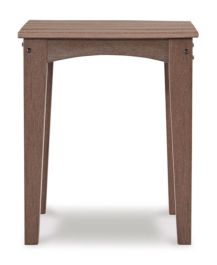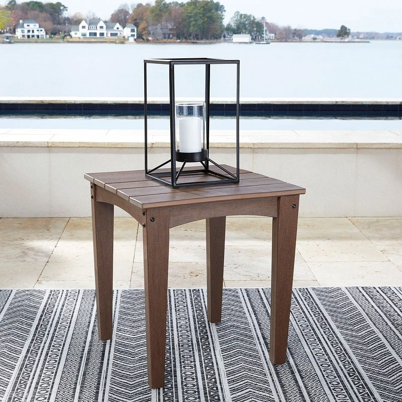 - OverviewGet back to nature with the relaxed styling of the Emmeline Outdoor End Table by Signature Design. Crafted of MEGA TUFF HDPE material, it combines the exceptional durability and weather resistance you need with the “wood look” you love. Rest assured, the slatted tabletop sheds rainwater so you can enjoy alfresco living rain or shine.