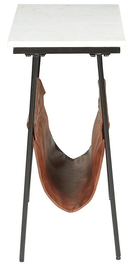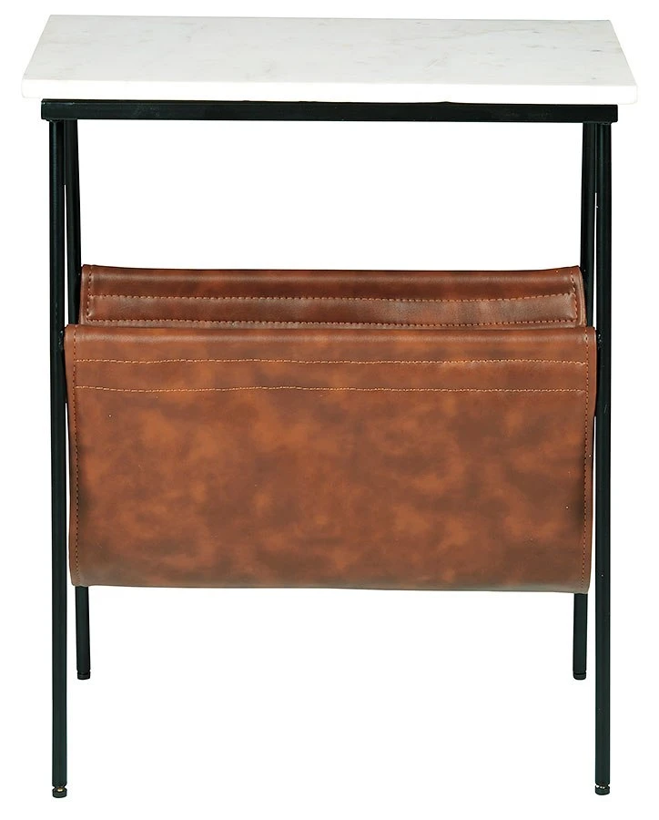 - OverviewWith its mixed media design, this accent table with magazine holder is what’s new – and what’s you. Fusion of black metal, white marble and brown faux leather creates a contemporary aesthetic that’s the genuine article.