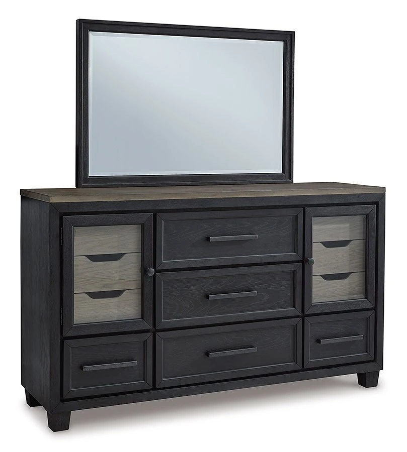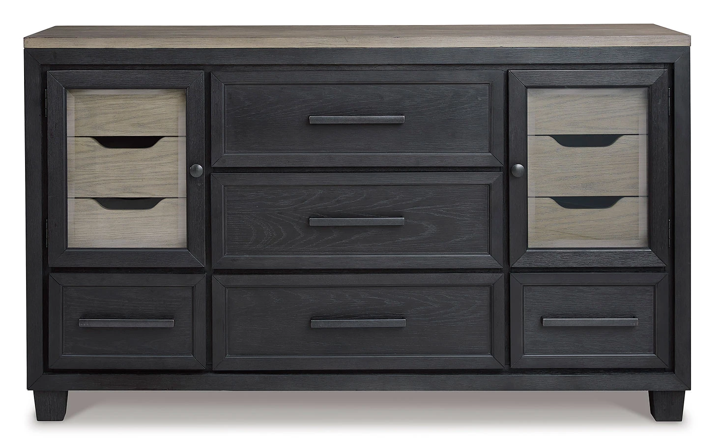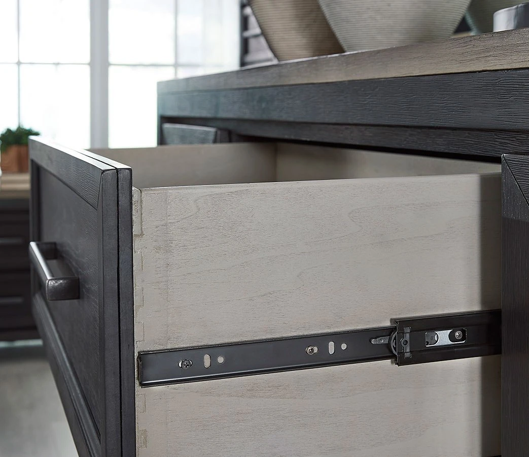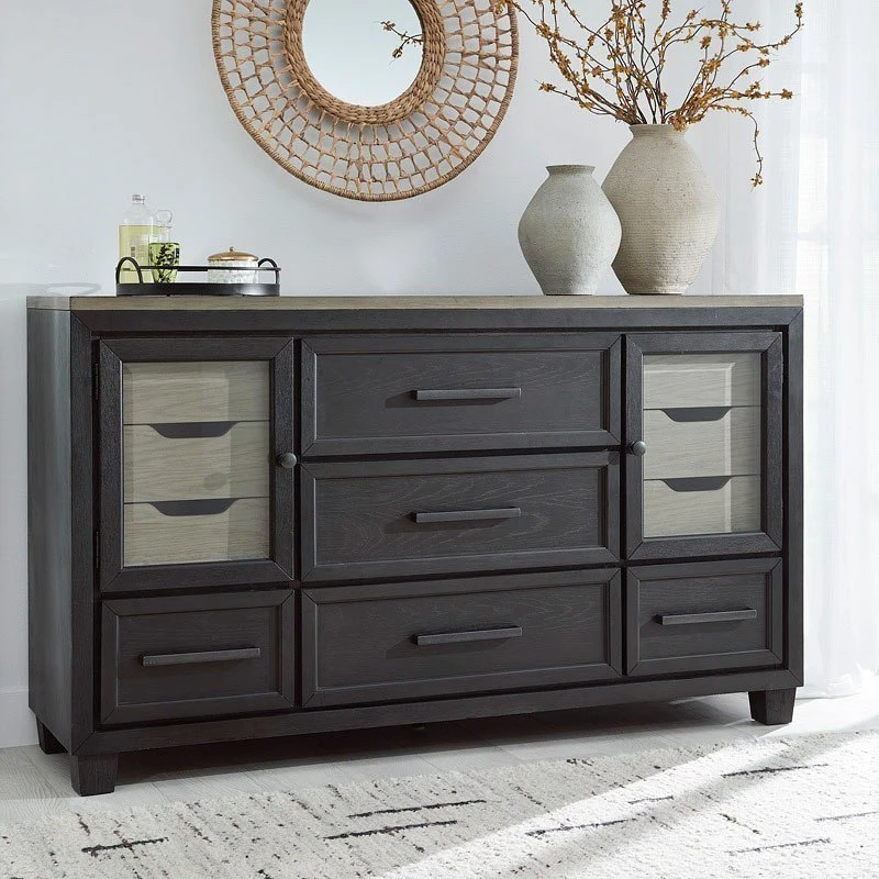 - OverviewThis Foyland dresser by Signature Design is casual contemporary style simply done right. Its two-tone color scheme features a rich brushed black main color accented with a beautiful dusty grayish brown wood tone. With 11 soft-close drawers (three located neatly behind each door) this dresser offers plenty of storage to accommodate your wardrobe needs with ease.