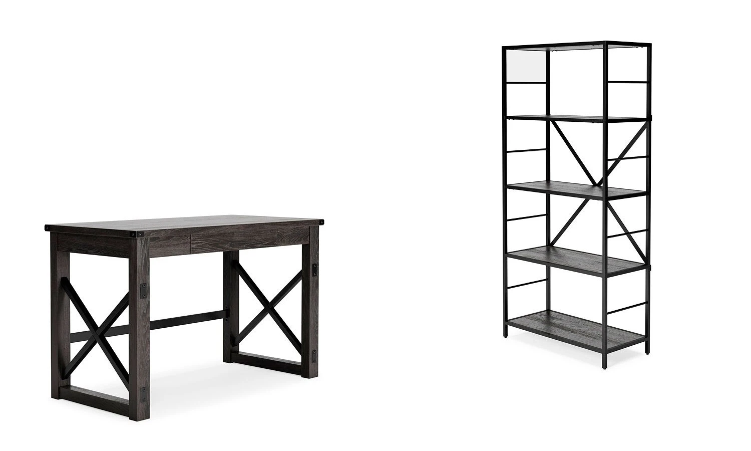 - OverviewLove an urban farmhouse aesthetic? Make it work to your advantage with this beautifully styled Freedan Desk by Signature Design. This simply striking choice in home office furniture has an unmistakable farmhouse feel thanks to design elements including a gray decorative wood grain laminate contrasted with cross-buck rails, metal accents and a stretcher in black. Perfect for office supplies, the desk includes a handy center drawer with hardware-less aesthetic to help keep your desk top clutter free
