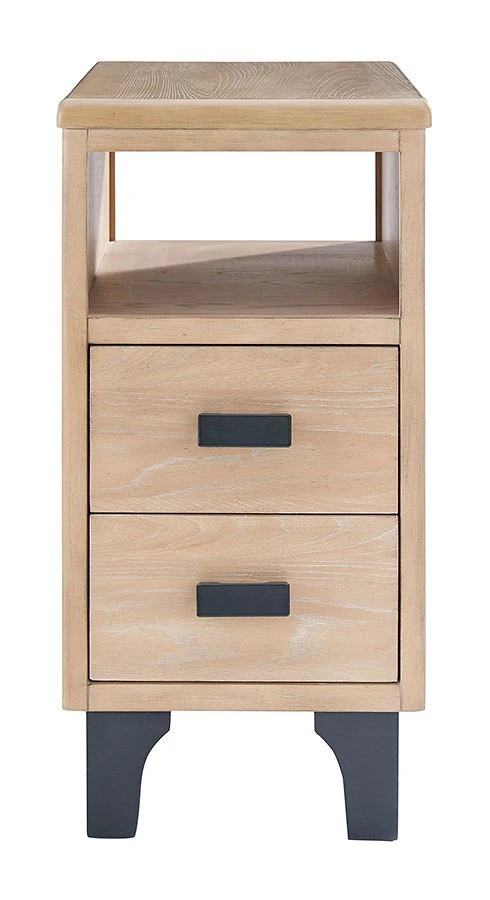 - OverviewCasual contemporary design with a clean silhouette. That’s the beauty of this Freslowe chairside end table. Quality crafted with elm veneer, its light natural wood tone lends a fresh, organic look. Two lower smooth-gliding drawers store smaller items, while an open shelf above keeps chairside essentials close at hand. The sleek accents coordinate beautifully with the less-is-more profile.