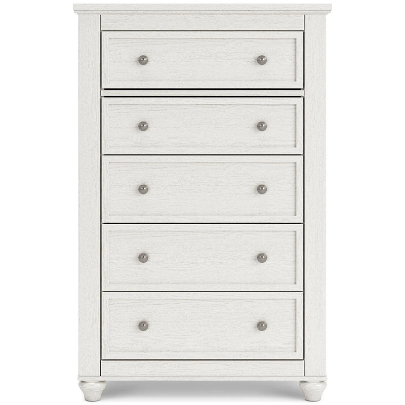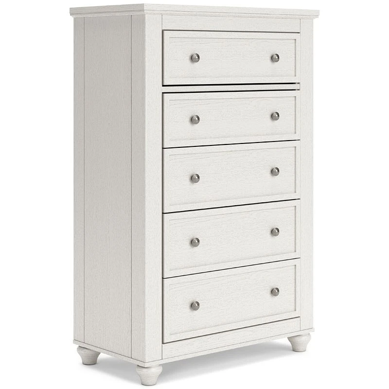 - OverviewBrighten up your bedroom with this Grantoni 5-drawer chest by Signature Design. The piece delights with a soft white finish and cottage quaint styling. When done in the right color, even a simple design can take on a fashionable flair.