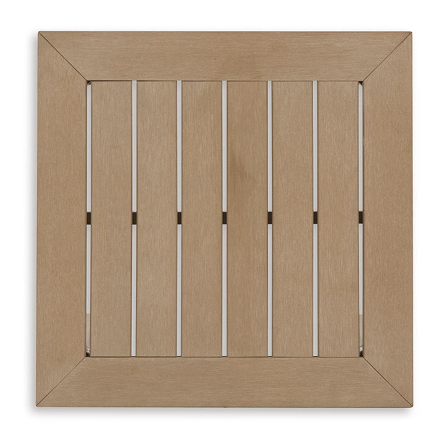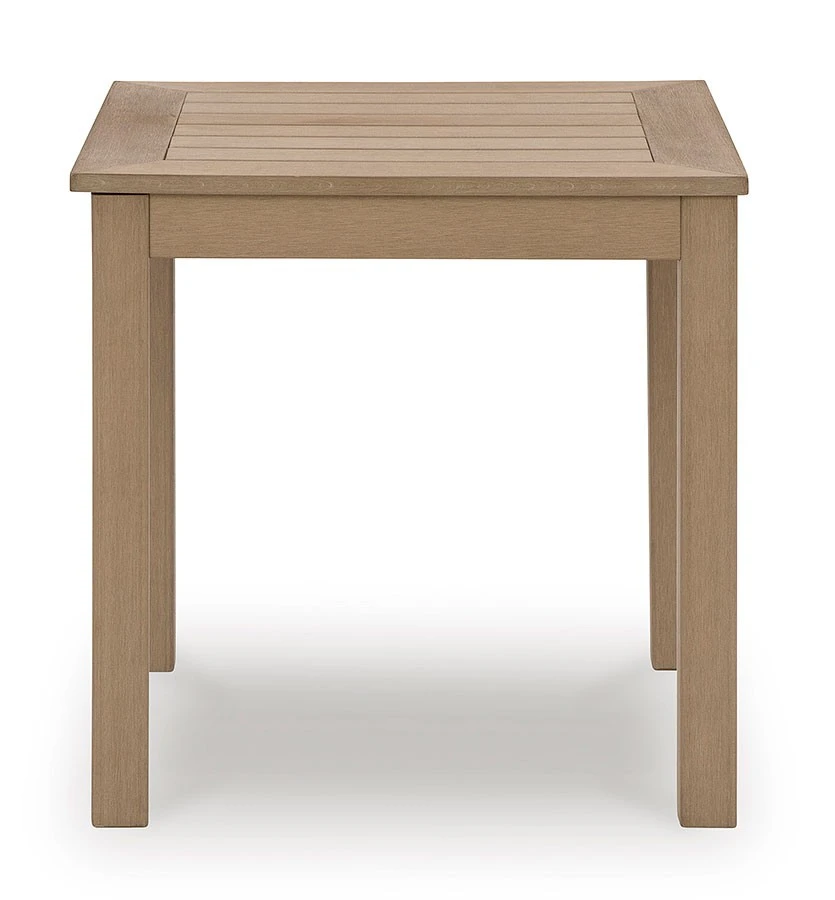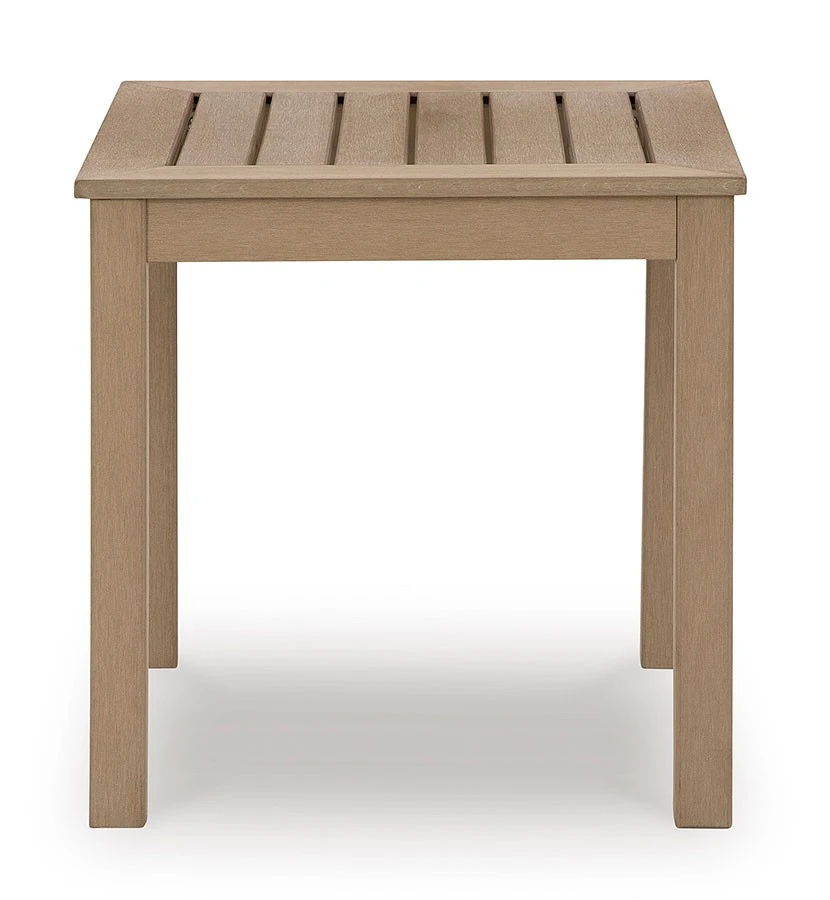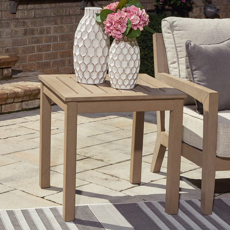 - OverviewThis Hallow Creek Outdoor End Table by Signature Design is a beautiful addition to any outdoor living space. Effortless in its simplicity, this piece echoes your easygoing sensibilities. Combining durable, cutting-edge engineered materials, its Weatherwood construction in a blond wood color enhances the contemporary design. Pair this table with the matching sofa and chairs for a spectacular backyard or patio seating arrangement.