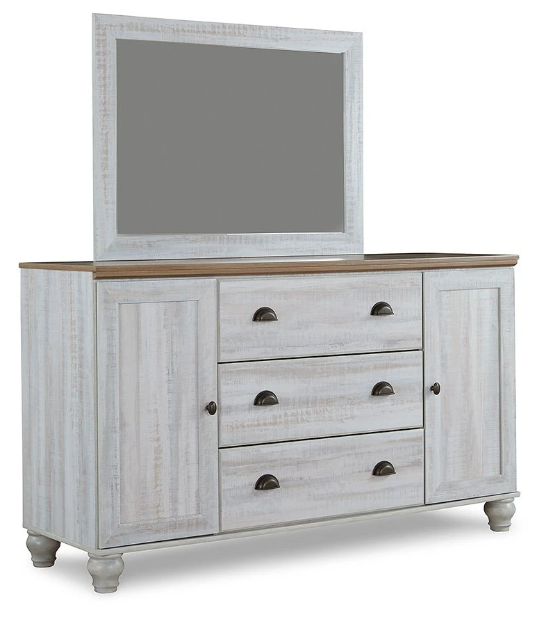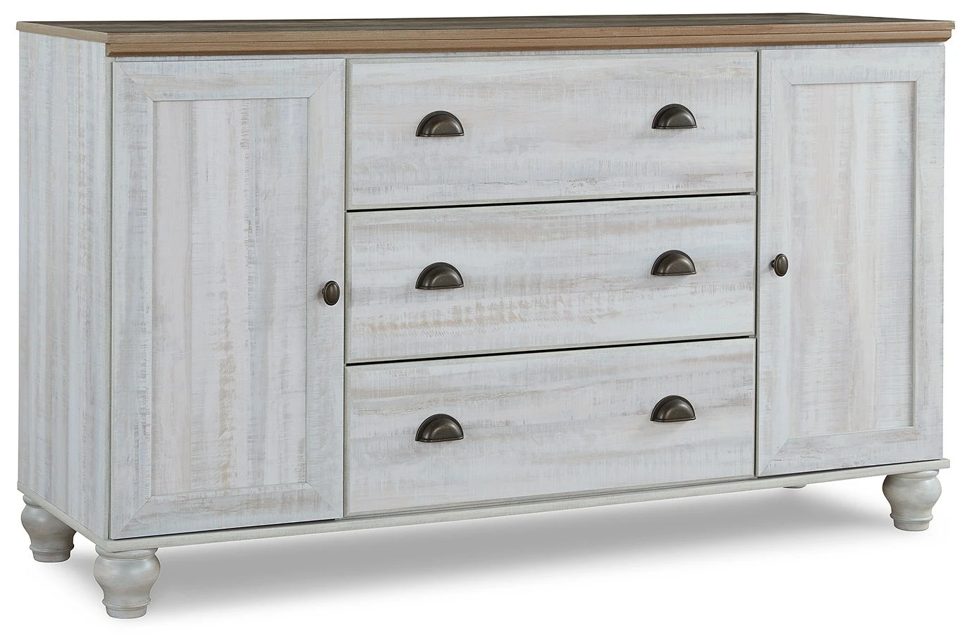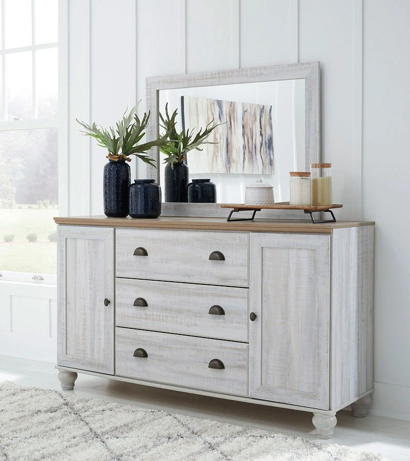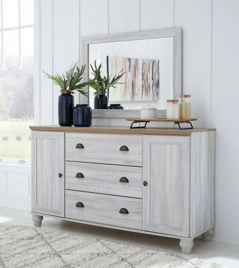 - OverviewBeautifully simple yet rich with character, this Haven Bay dresser by Signature Design is a dream come true. It masters the art of simplicity with a charming two-tone look of weathered white complemented by a replicated oak grain. Three spacious drawers and two doors with adjustable shelves provide plenty of room for folded clothes and fashion accessories. Bun feet add a distinctive look, while dark bronze-tone hardware is a brilliant finishing touch. If farmhouse style is calling your name, answer with this timeless treasure.
