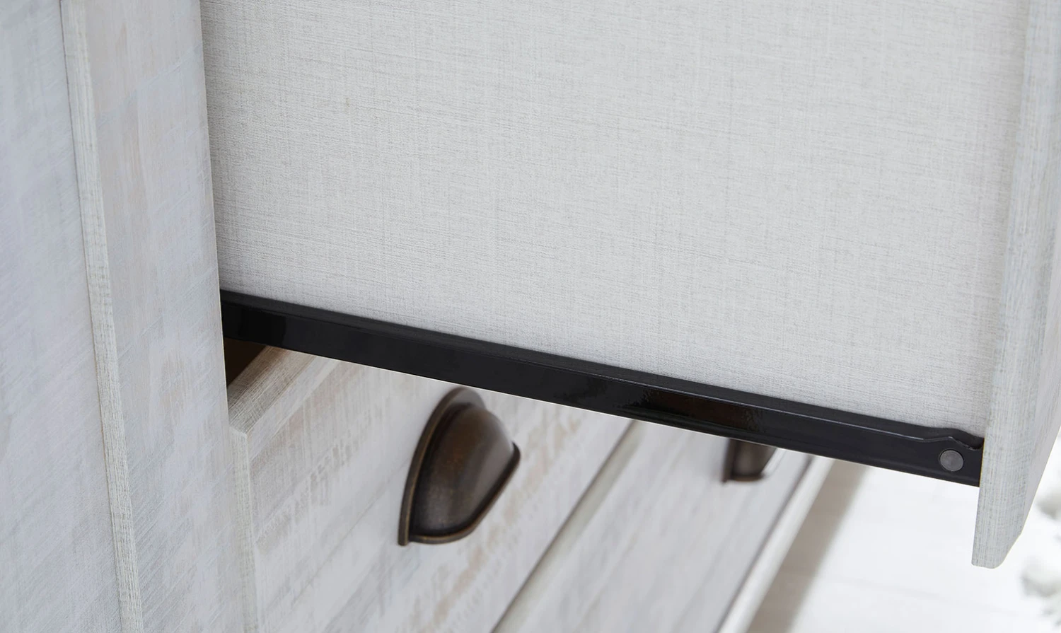 Drawers are lined with a replicated linen design for a clean, finished look