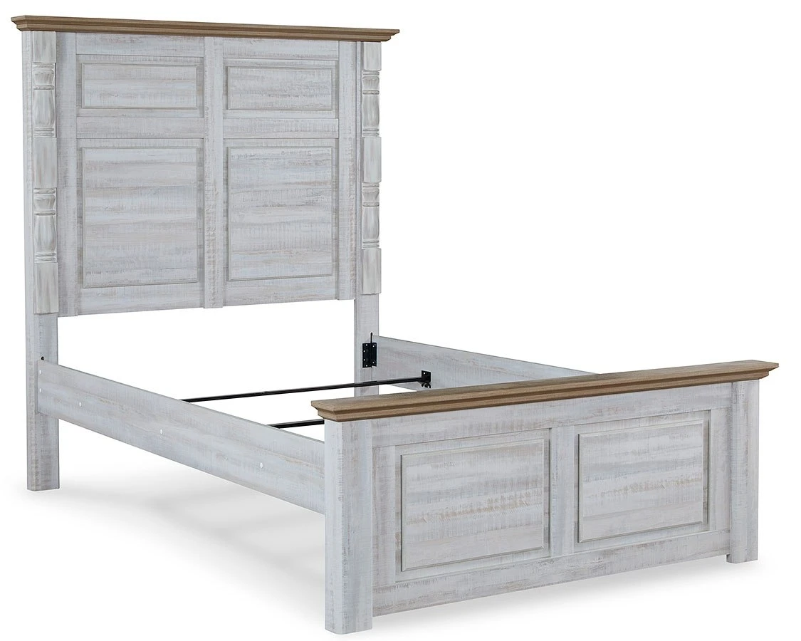 - OverviewBeautifully simple yet rich with character, this Haven Bay Panel Bed by Signature Design is a dream come true. It masters the art of simplicity with charming two-tone style. The gently weathered white finish is complemented by replicated oak grain on the headboard and footboard. Crown moulding and decorative turned posts add appeal. If farmhouse style is calling your name, answer with this timeless treasure.
