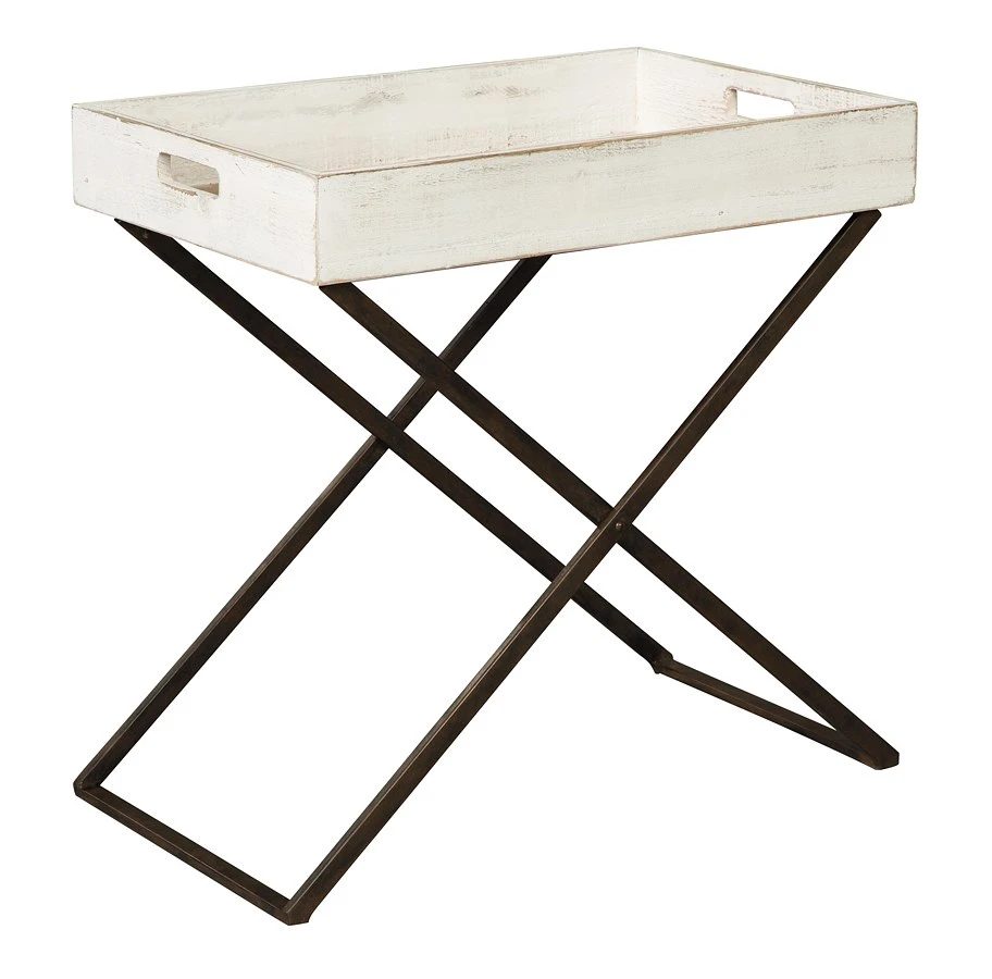 - OverviewCasually cool style served with a side of bygone charm. Pairing solid wood and metal, the Janfield Accent Table by Signature Design by Ashley Furniture with “tray” top commingles a distressed aesthetic with clean-lined, modern appeal. Combination of three finishes gives this simply striking table so much distinction.