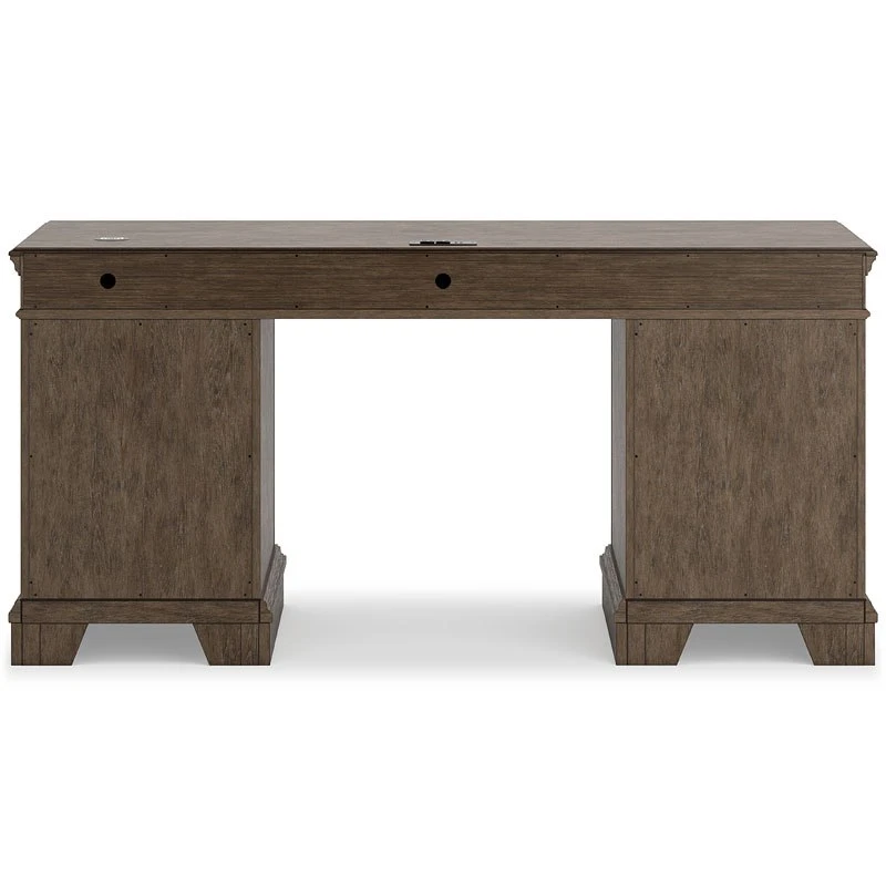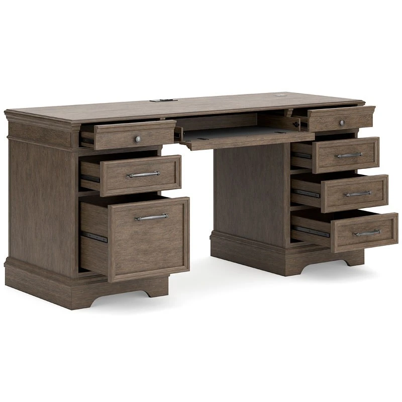 - OverviewMake a style statement with the Janismore credenza by Signature Design. Its traditional design is updated with an on trend weathered gray finish and wire-brushed texture. The credenza’s eight drawers, including a drop-front keyboard tray, add up to a well-organized workspace, while USB and wireless charging make staying productive that much easier.